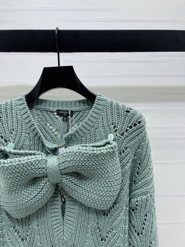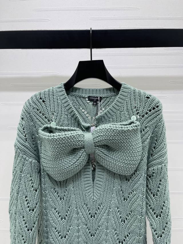 New Arrival! High-Quality Original Chane* 2025 Early Autumn Collection! Official Website Synchronized Hollow-Out Knit Dress! Custom-made all-cotton yarn, high-quality and comfortable knit long-sleeved dress with a full hollow-out triangular pattern. Ribbed edges on the cuffs and hem for a more fitted and slimming silhouette. The front features a rhinestone cutout and double C-button closure with a large bow decoration, highlighting its sophisticated style. Slightly sheer for a relaxed and luxurious look. Suitable for wearing alone or layering, a top choice for all seasons! 2 colors! Sizes SM-L3! High-quality bulk order.