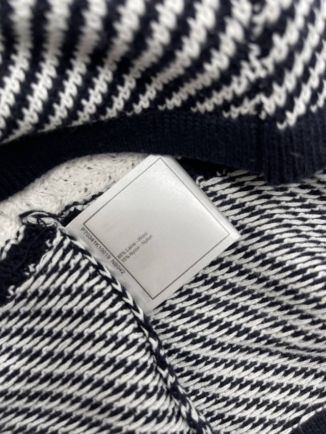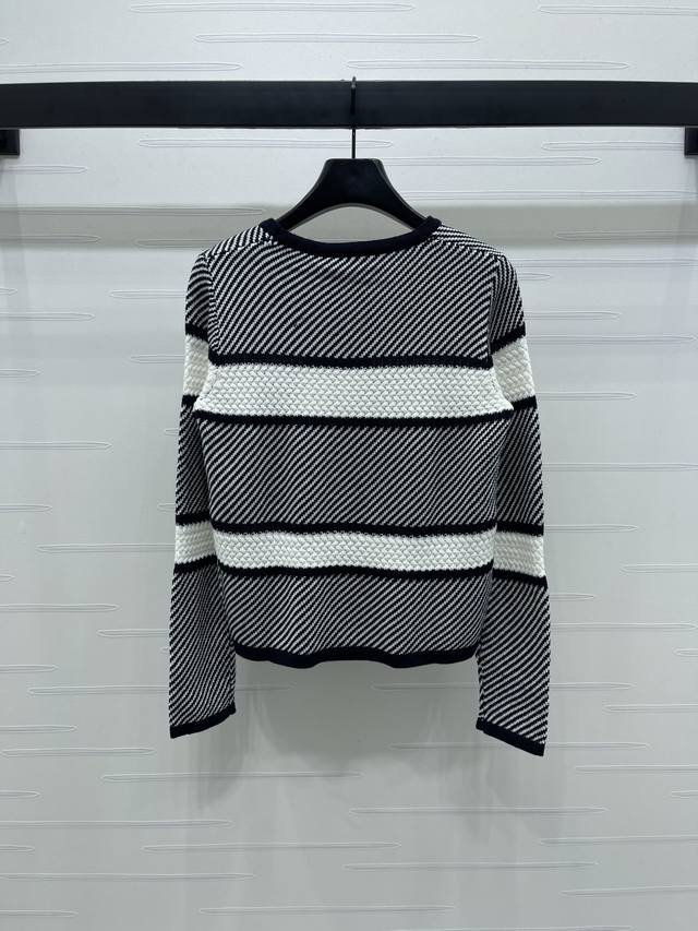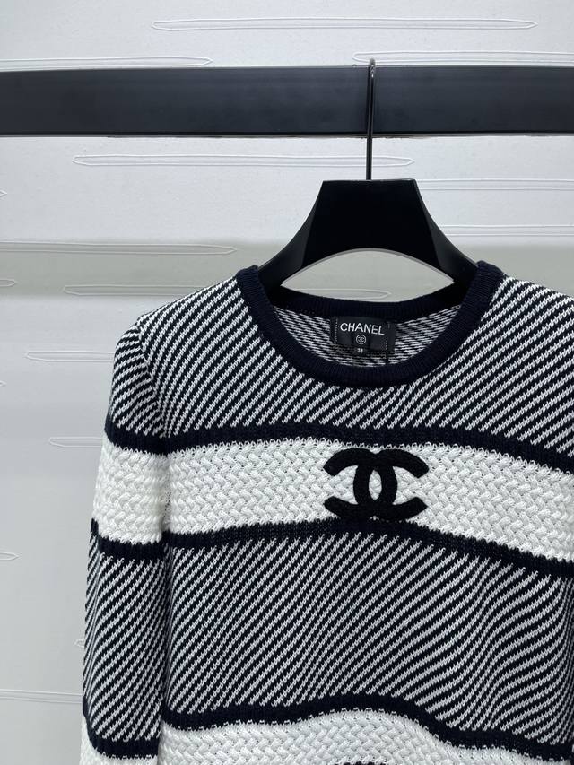 New Arrival! High-Quality Original Chane* 2025 Early Autumn Collection! Striped Color-Blocked Knit Long-Sleeve Top! Custom-made imported yarn knit short-sleeve top with contrasting stripes and a fixed-dye process perfectly replicating the original look. Soft, skin-friendly, comfortable, and stylish. The round neckline is just right, showing off the skin and enhancing the head and shoulder proportions for a slimmer look. The chest features a double C logo and 3D crochet details for a luxurious style. The strong elasticity flatters the figure, making it playful, youthful, and brightening. Perfect for everyday wear or casual gatherings! 1 color! Sizes SM-L3! High-quality bulk order.