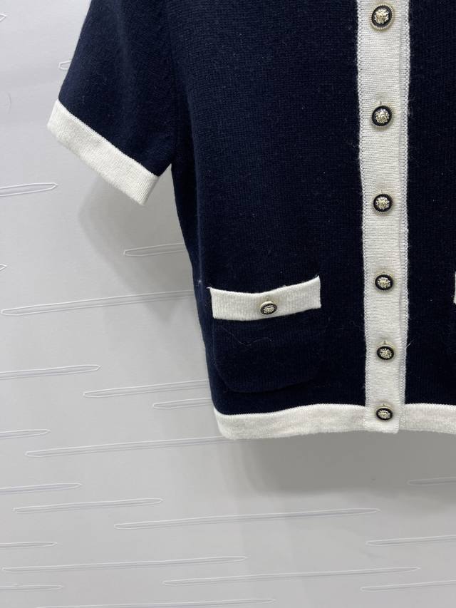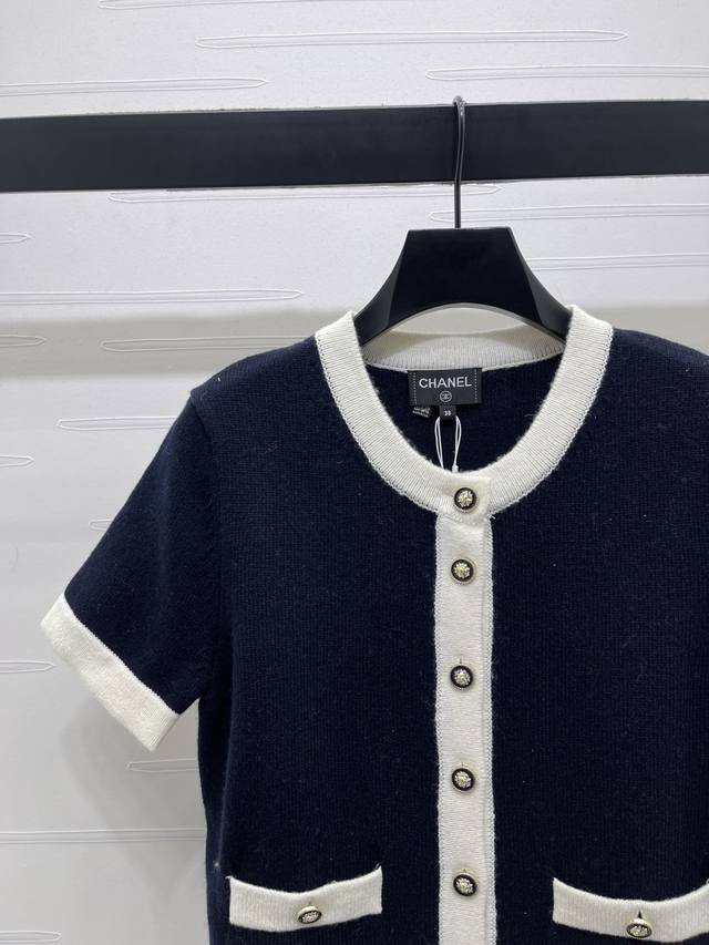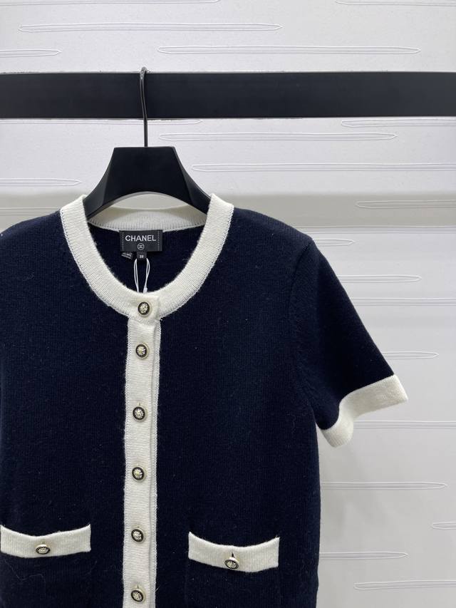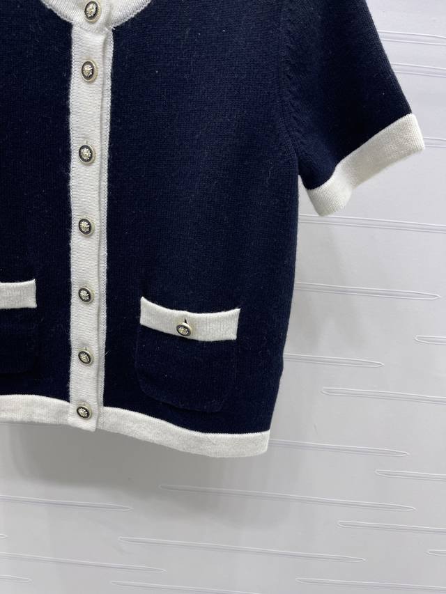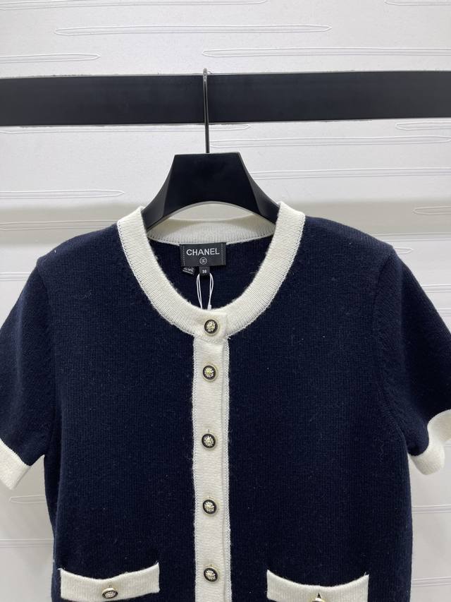 New Arrival: High-Quality Original Chanel* 2025 Autumn/Winter Collection! Color-blocked Round Neck Knit Short-Sleeve Cardigan! Crafted from custom cashmere yarn with a fine knit density, the soft, comfortable texture is gentle on the skin. Features a round neck, button-down shoulders, and a camellia-patterned round button embellishment on the front, reflecting light and creating a relaxed, minimalist look. The color-blocked trim extending from the collar and front to the hem and cuffs echoes the pocket edges, adding depth and dimension to the design. The flattering fit is forgiving and exudes style! 1 color available! Sizes SM-L3! High-quality bulk order A706B420C DDD