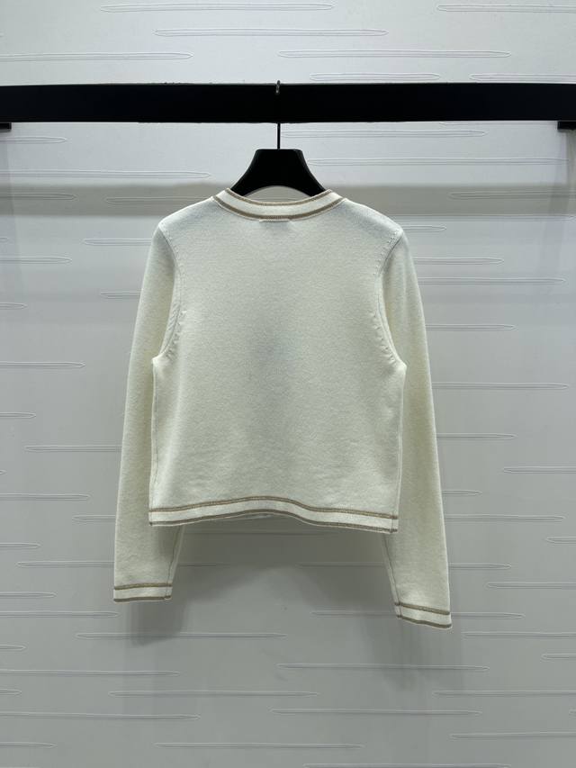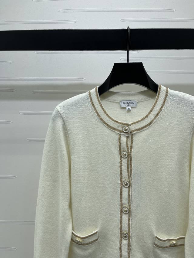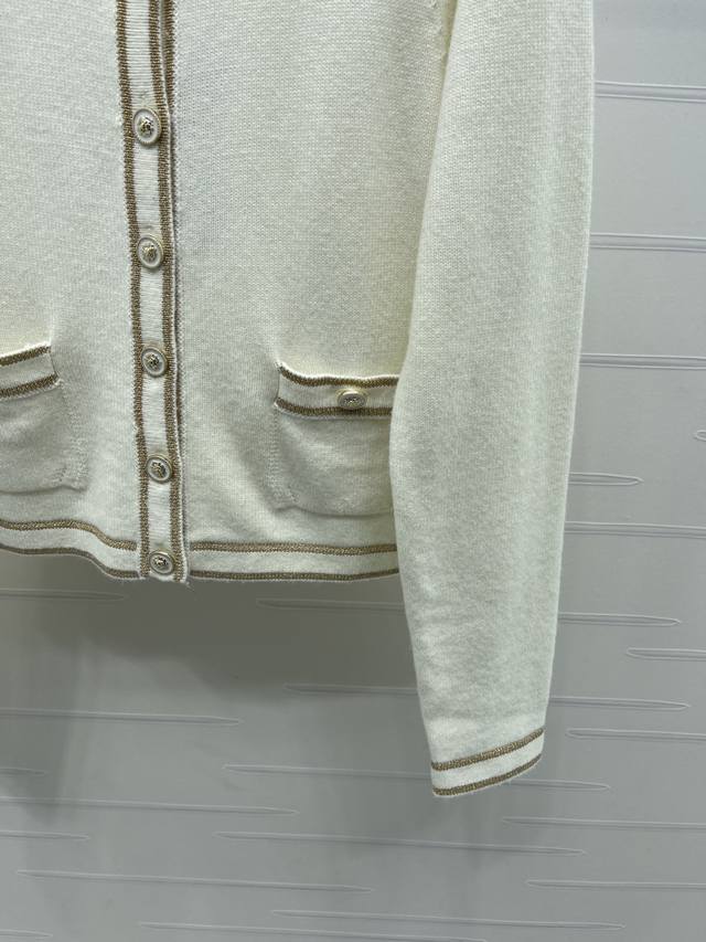 New Arrival: High-Quality Original Chanel* 2025 Autumn/Winter Collection! Gold-Trimmed Crew Neck Knit Cardigan! Crafted from custom wool yarn with a fine knit density, this soft and comfortable cardigan features a crew neck, button-down shoulders, and a camellia-patterned round button embellishment on the front, reflecting light and creating a relaxed, minimalist look. The contrasting stripes extending from the collar and front to the hem and cuffs add depth and dimension to the design. The forgiving fit enhances the overall style. Available in 1 color! Sizes SM-L3! High-quality bulk order A706B480C DDD