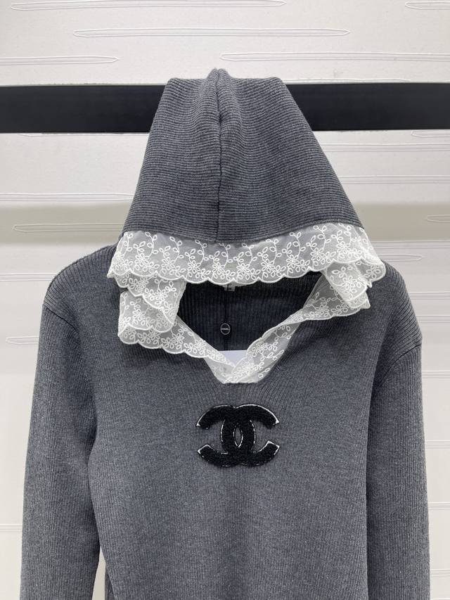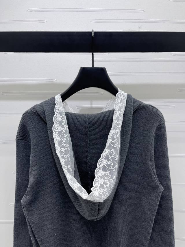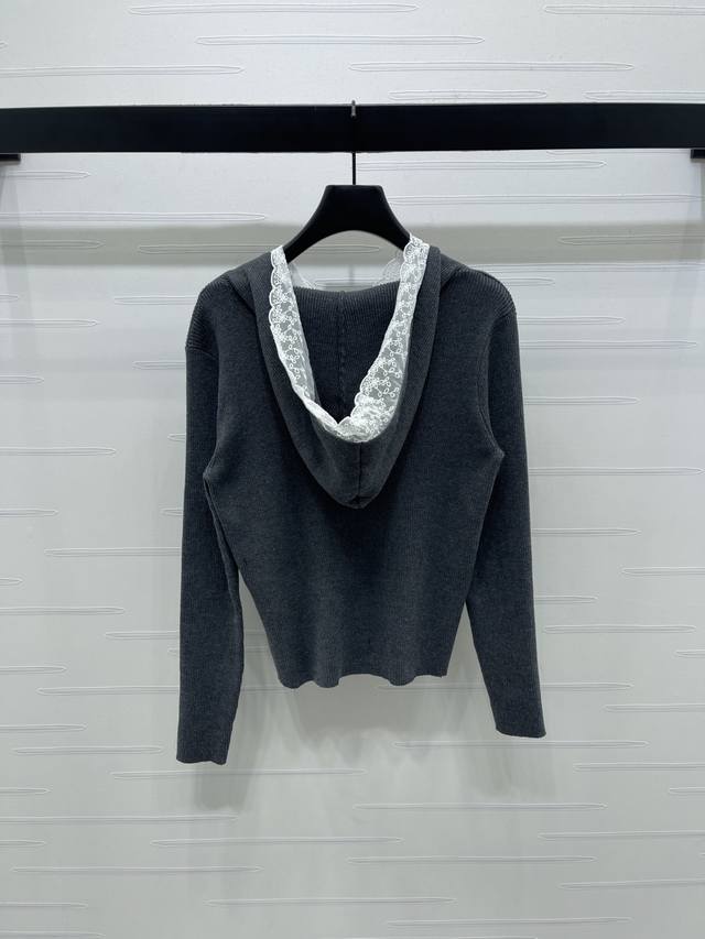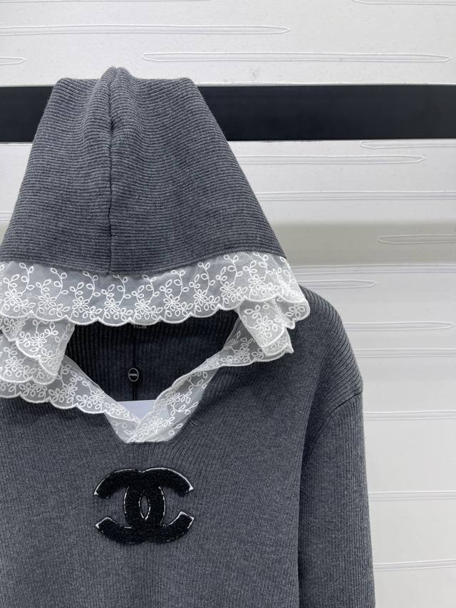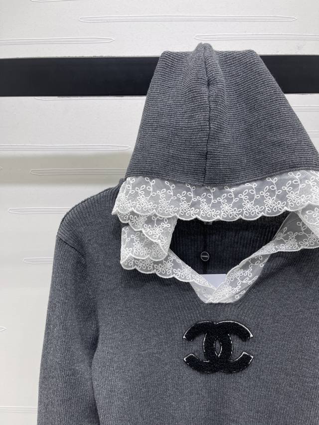 New Arrival! High-Quality Original Chanel* 2025 Early Autumn Collection! Hooded Lace Knit Long-Sleeve Sweater! Made with custom wool blend yarn, it boasts a premium, comfortable, and soft texture. Features a hooded V-neck long-sleeve design, lace trim at the neckline, and a contrasting double C logo embroidery on the chest, exuding a sophisticated and fashionable vibe. The elegant color scheme creates an artistic atmosphere, making the style more timeless, versatile, sweet, and youthful! Available in 2 colors! Sizes SM-L3! High-quality bulk order.