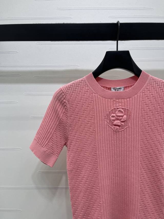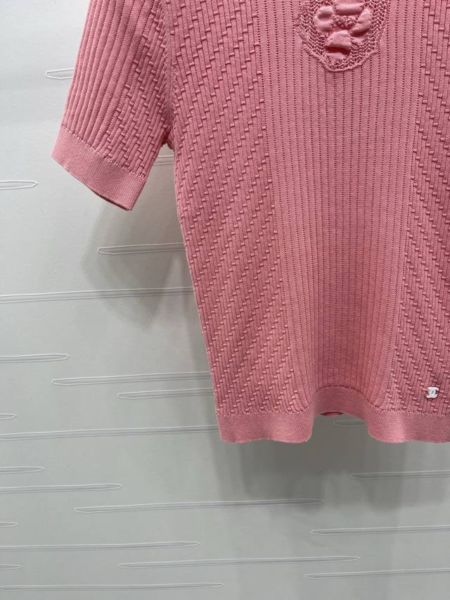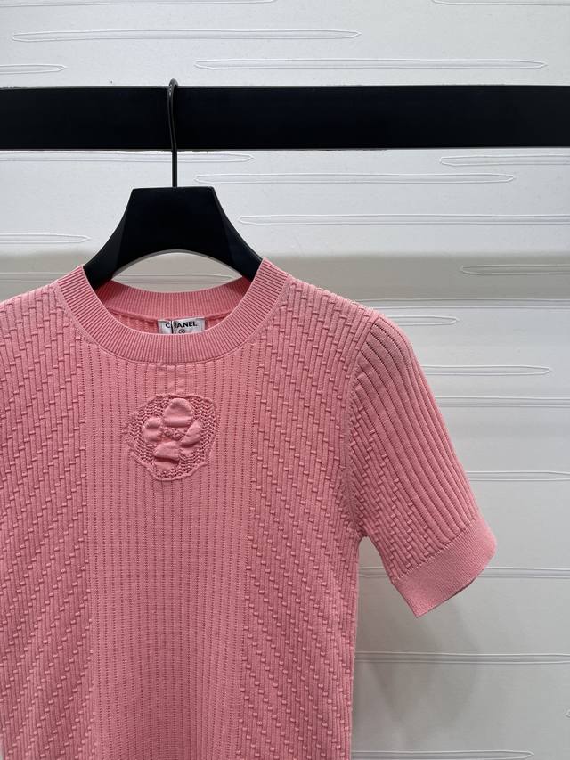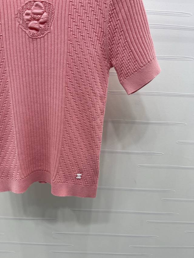 New Arrival: High-Quality Original Chanel* 2026 Early Spring Collection! Camellia Knit Short-Sleeve T-Shirt! Made with custom cotton-wool yarn, soft, delicate, and comfortable. The round neck knit short-sleeve features vertical ribbed trim with a textured finish, adorned with a central camellia flower. Exquisite and stylish, it has elastic ribbed edges for a slimming effect. The double C logo at the hem adds a finishing touch, showcasing the brand's style. Elegant and sophisticated. Suitable for everyday commuting. Comes with a diamond-patterned dust bag! 5 colors! Sizes SM-L3! High-quality bulk order.