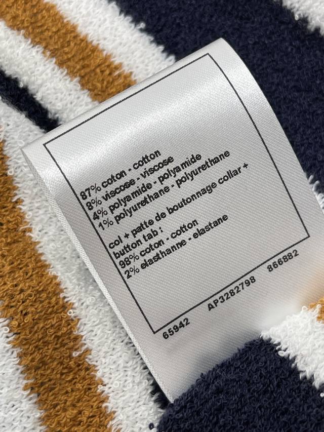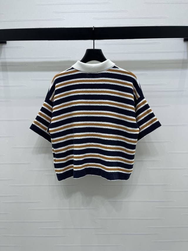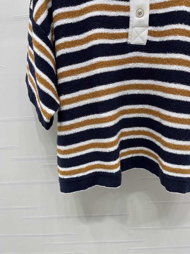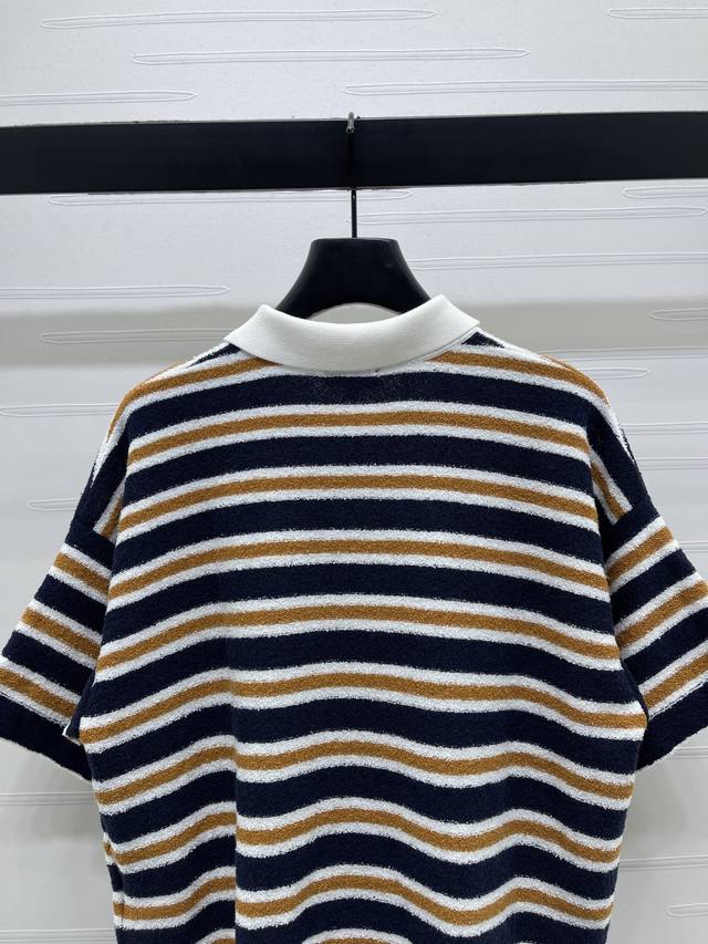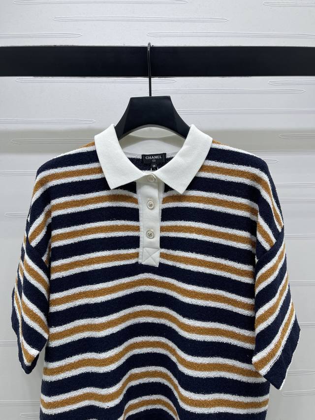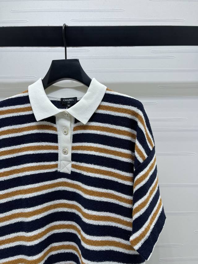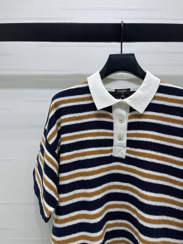 New Arrival! High-Quality Original Chanel* 2026 Early Spring Collection! Polo Collar Knit Striped Short-Sleeve T-Shirt! Made with custom Yb cotton yarn, fine knit for a soft, comfortable, and skin-friendly texture. Features a turn-down collar, half-open placket, and a relaxed, dropped shoulder design for a relaxed, unisex style. Three horizontal stripes adorn the body, adorned with round camellia buttons for a fashionable and sophisticated look. Available in 2 colors! Sizes SM-L3! High-quality bulk order A706B410C DDD