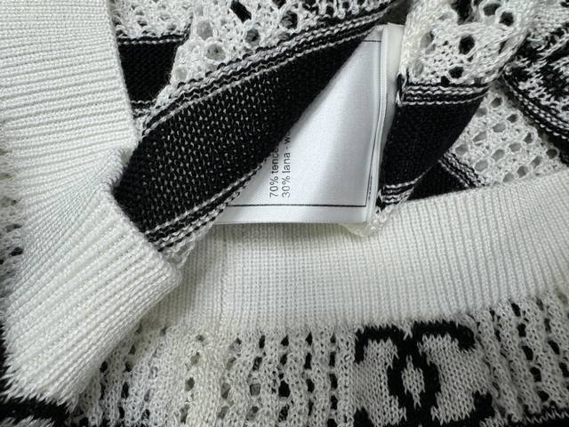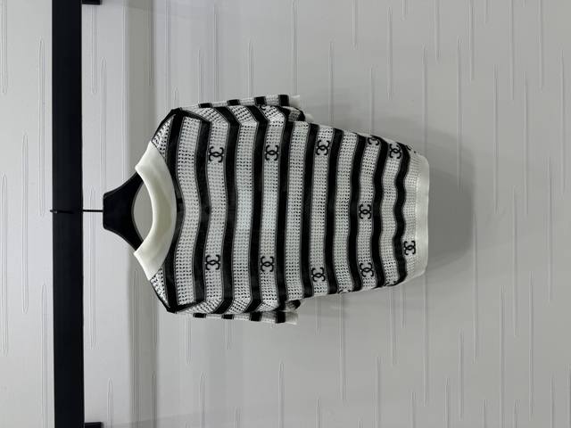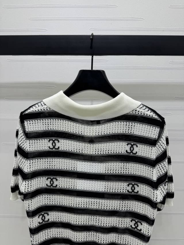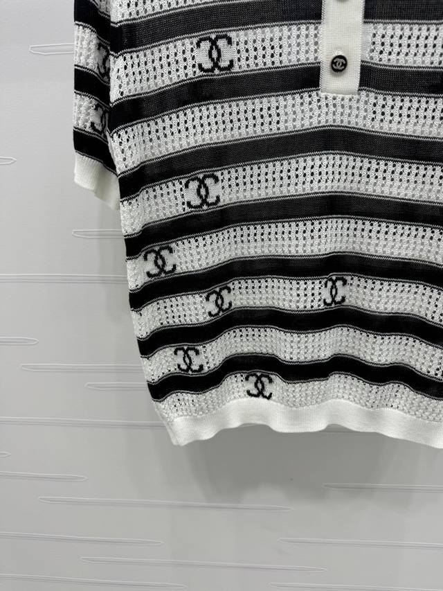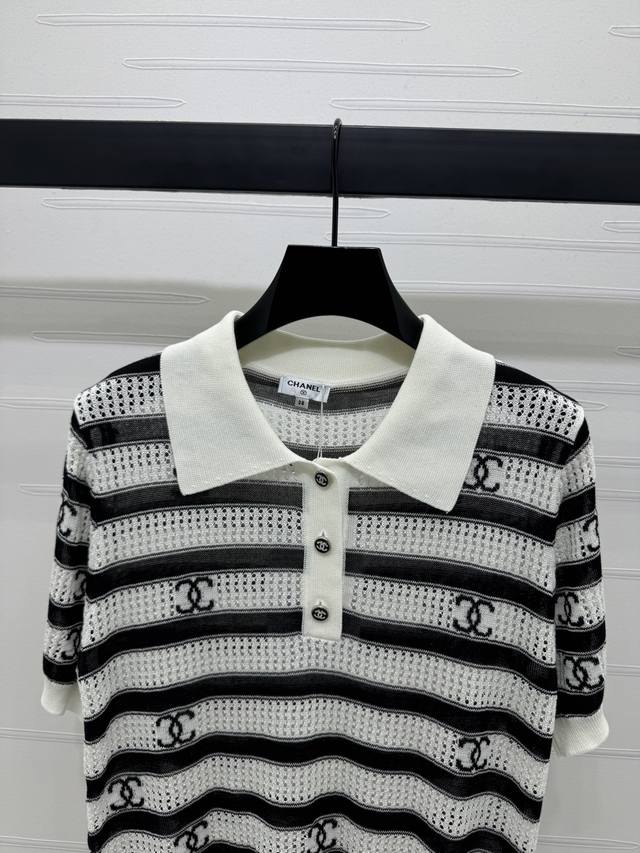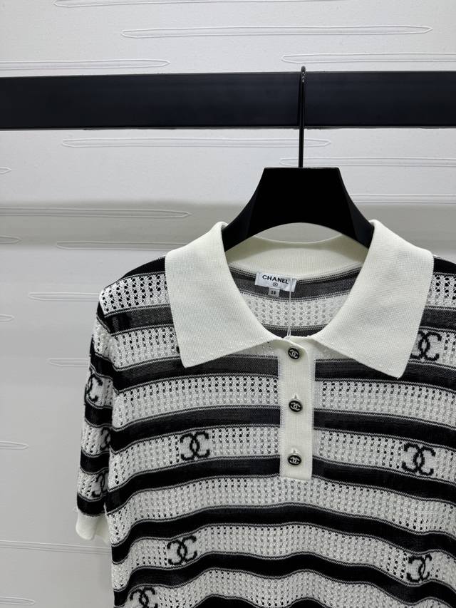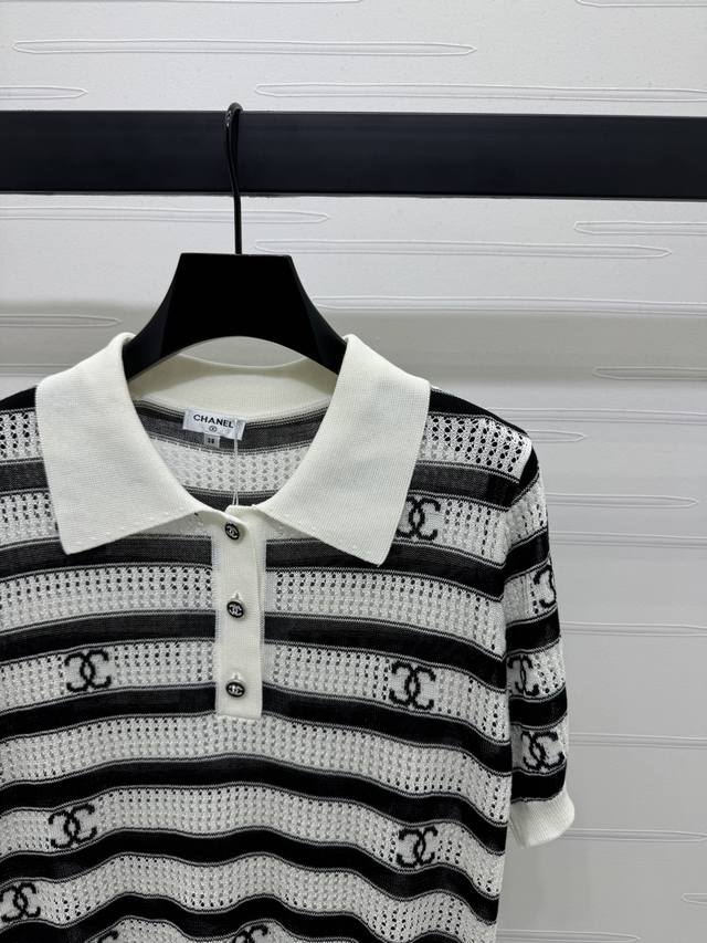 New original high-end quality Chane* 2025 Spring and Summer latest series! Striped hollow lapel knitted short sleeves! Custom imported yarn weaving fixed color and dyeing perfectly restore the appearance of the lapel knitted short sleeves tailoring open button adjustment all over the body two-color stripes collide letter logo to form a sense of hierarchy strong retro style regular version accommodating body slightly hollow light full sweet and foreign style! Color! SM-L3 size! High quality large goods A706B400
