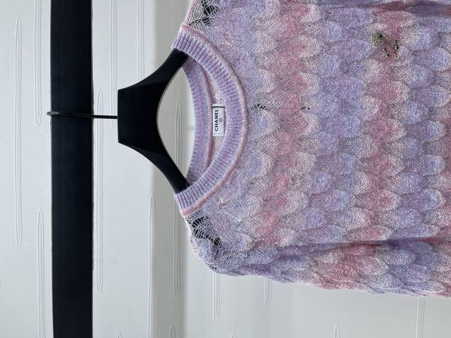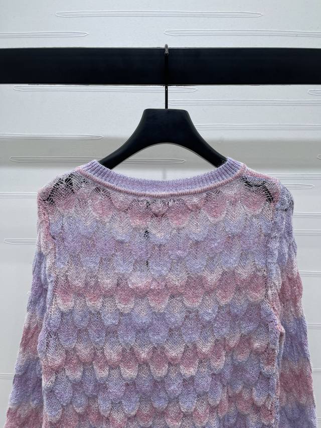 New, original, high-quality Chane* 2025 Early Fall collection! Feather-inspired hollow pullover long-sleeved sweater! Custom-made wool knit for a premium, comfortable, breathable feel. Round neck, long-sleeved top with floral and metal logo on the chest, highlighting the brand's personality and a sophisticated look. Gradient-colored hollow feather crochet patterns throughout the body, combined with exquisite contrasting threaded edging, create a sexy and individual look with this simple style. The loose fit creates a slimming effect, showcasing a relaxed, effortlessly luxurious and fashionable vibe! 1 color! Sizes SM-L3! High-quality, bulky stock A706B340C