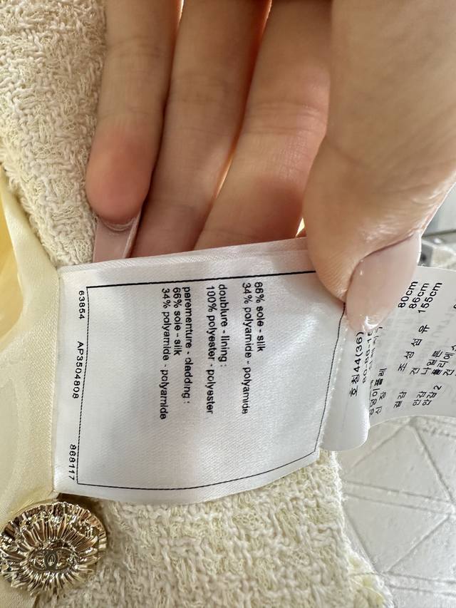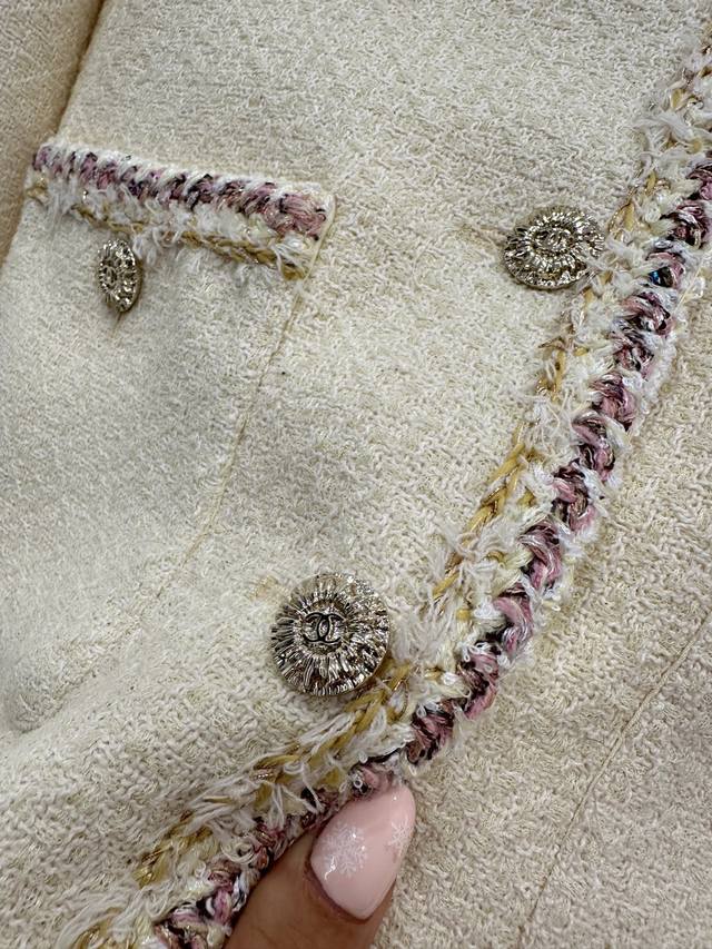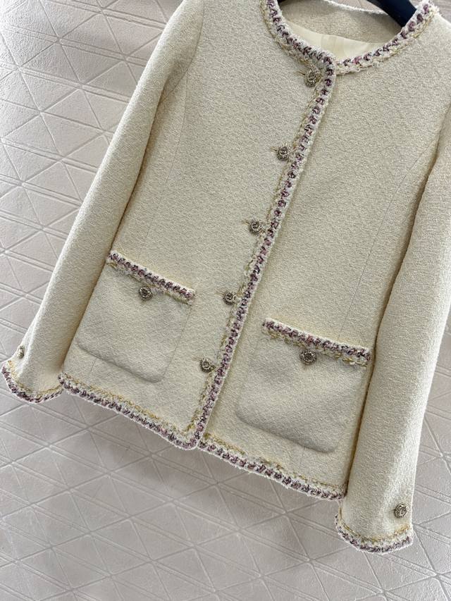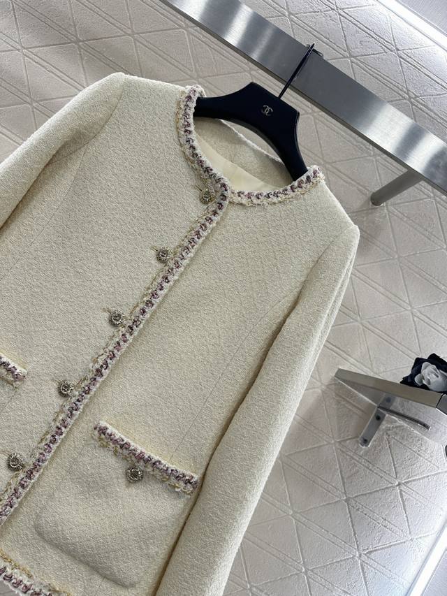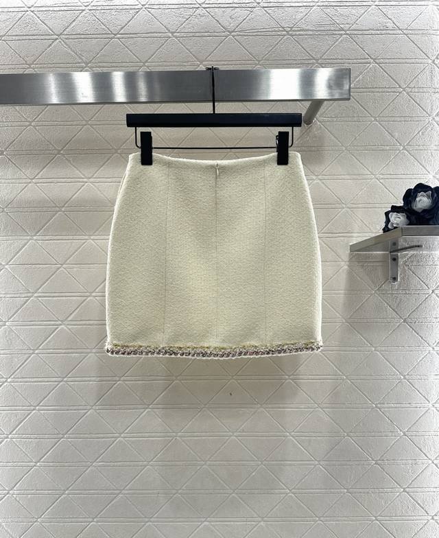 p300Chane*2026 New Arrival Ddd Round Neck Tie-Trimmed Dress and Skirt Set Ddd Custom Yb Imported coarse wool fabric, high-quality and exquisite. The round neck dress jacket style features padded shoulders that fit the body well, making the figure appear slimmer and more upright. The neckline extends to the front hem, with black, white, and gold woven trim highlighting the details. The cuffs and pockets echo this design. The entire set is off-white with a delicate wool texture, exuding a sophisticated and elegant style. The matching straight skirt features contrasting trim details and double C-printed buttons that echo the waistband, perfectly embodying an elegant and wealthy feel. The set is luxurious and high-quality, intellectual and gentle, making it the perfect choice for Christmas, New Year's Day, and year-end parties. It will make you the center of attention. Custom fabric and accessories, please look for the high-quality version. Off-white, sizes 36, 38, 40. Jacket 400, Skirt 230 DDD