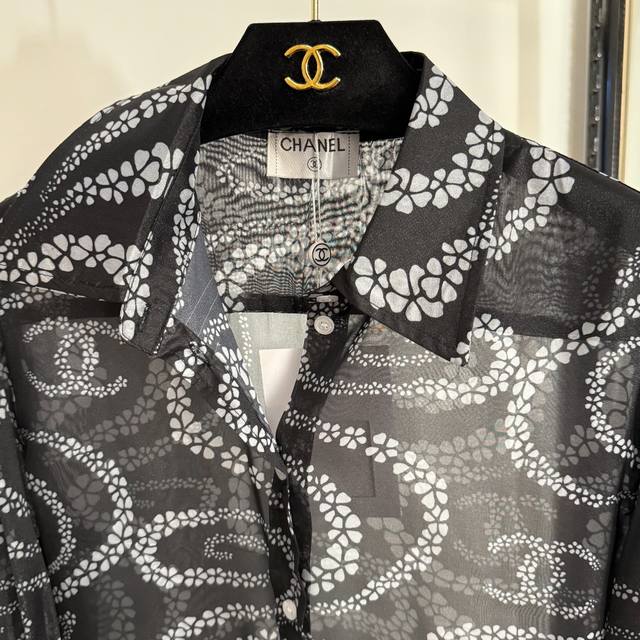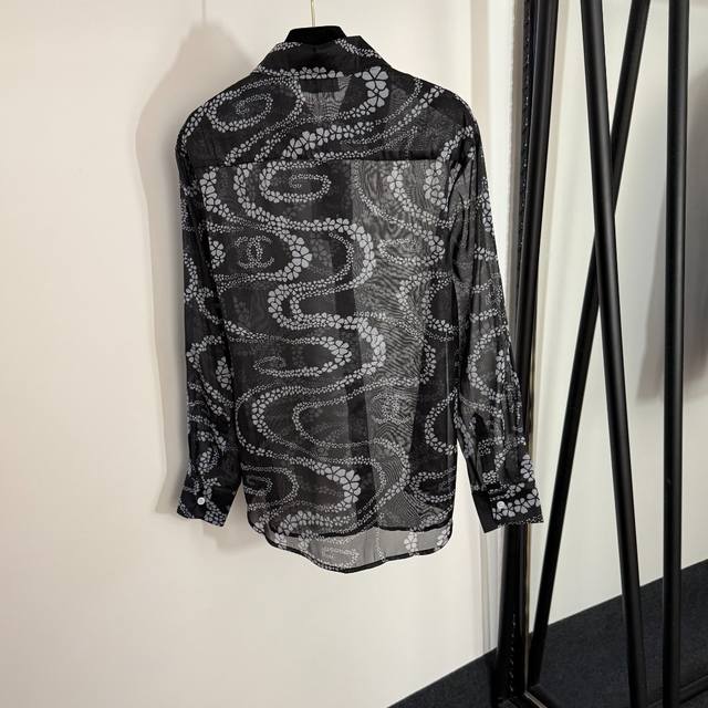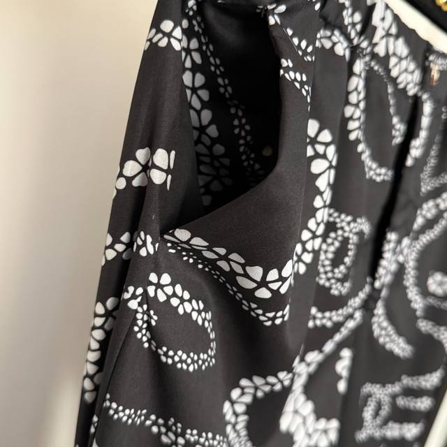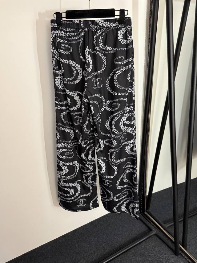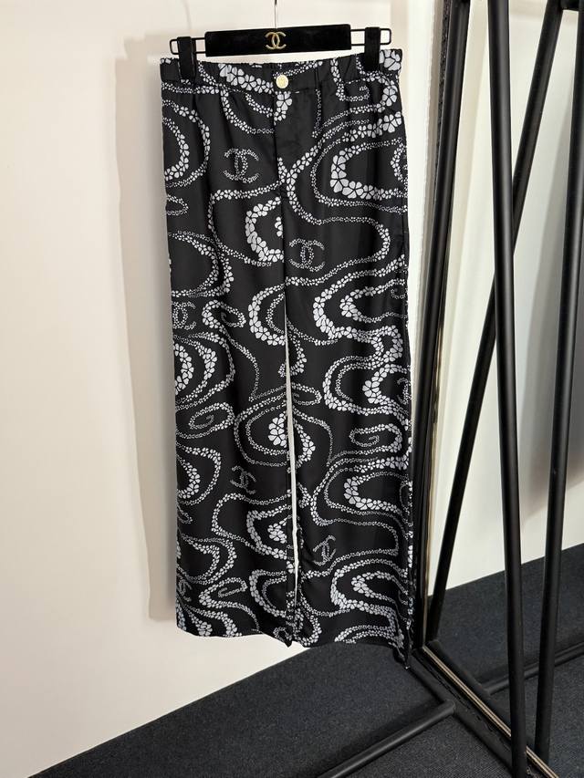 Style No. 20253999 Chane* newest suit, camellia fluid print long-sleeved shirt + high-waisted wide-leg trousers, black, pink, Sml, M; shoulder width 43, chest 98, sleeve length 57, length 68; waist 66 elastic, length 102.