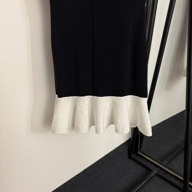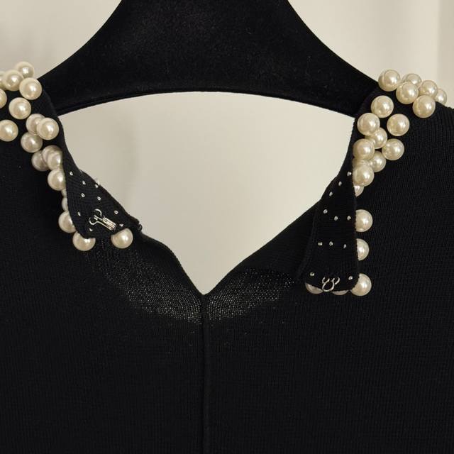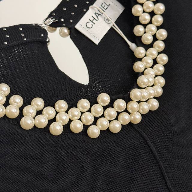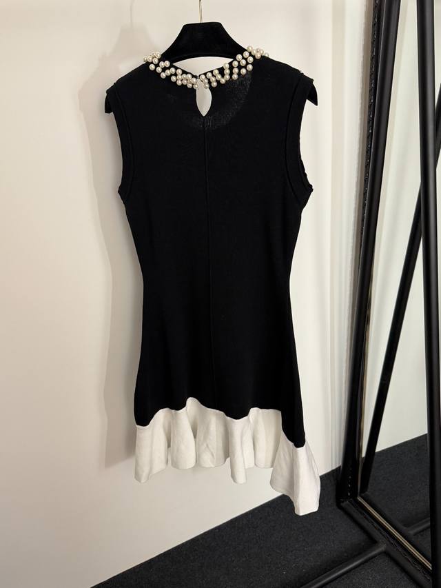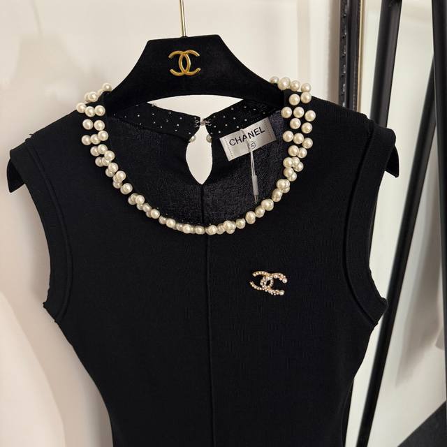 Style No. 20254065 Chane* new style small logo brooch color matching hem pearl round neck knitted vest dress, black, one size; bust 80, length 85.