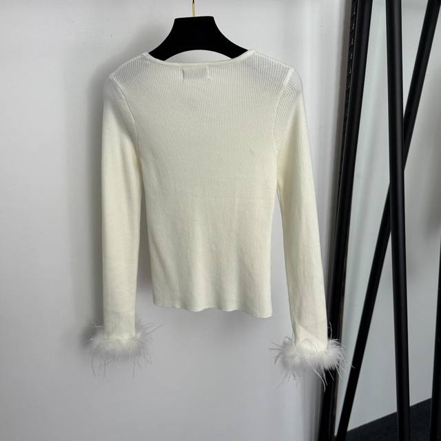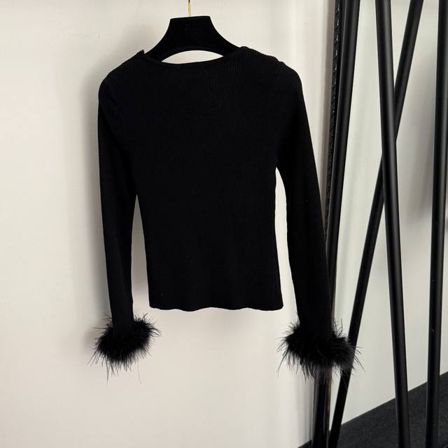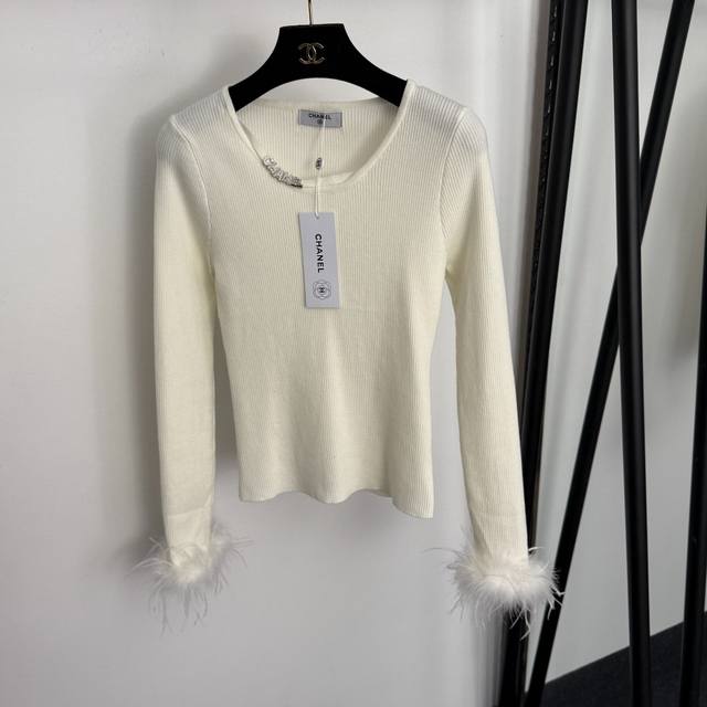 Style No. 20258405 Chanel* New Rhinestone Logo Letter Feather Cuff Long-Sleeve Knit Top, Black, White, One Size: Bust 66cm, Sleeve Length 60cm, Length 53cm; Weight: 0.270kg DDD