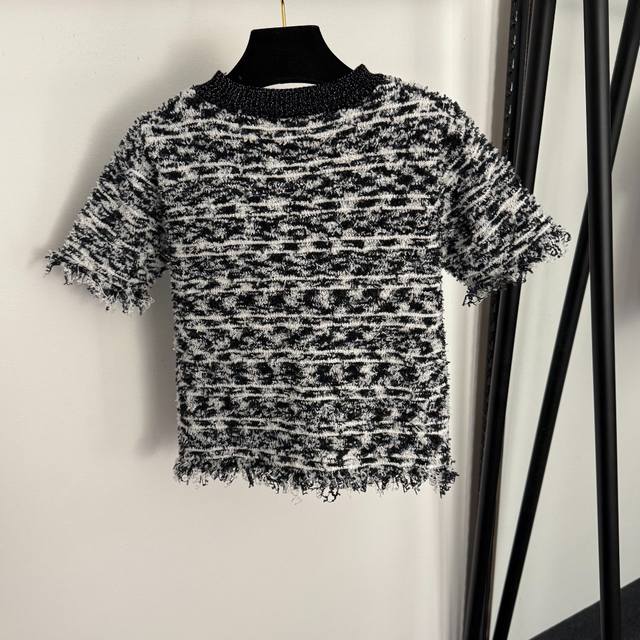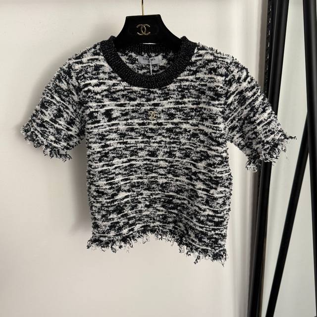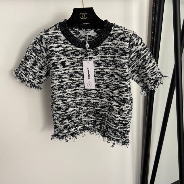 Style No. 20258452 Chanel* New Style Logo Tassel Striped Short-Sleeve Knit T-Shirt, White, Black, One Size: Chest 84cm, Sleeve Length 19cm, Length 47cm; Weight: 0.240kg. DDD