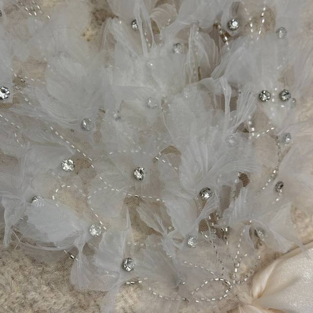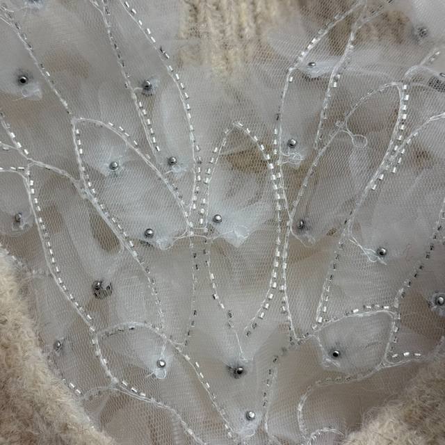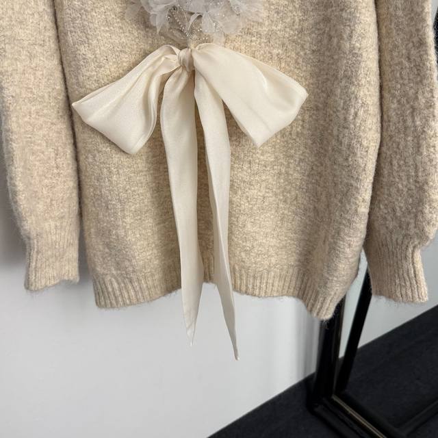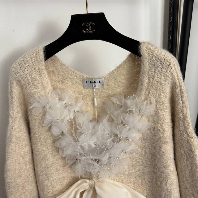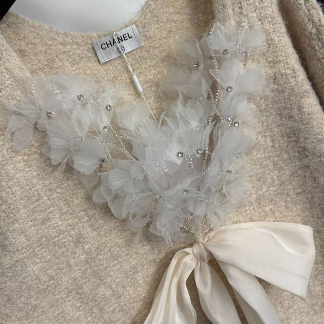 Style No. 20259285 Chanel*New Lazy Elegance Mesh Beaded Floral Bow V-Neck Long-Sleeve Knit Sweater, Apricot, Black, Red, Gray, One Size: Bust 114cm, Sleeve Length 44cm, Length 64cm; Weight: 0.555Kg