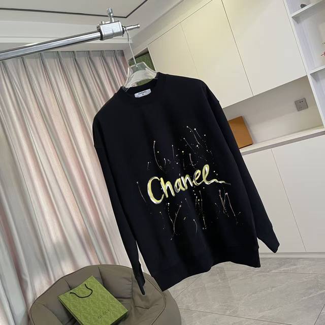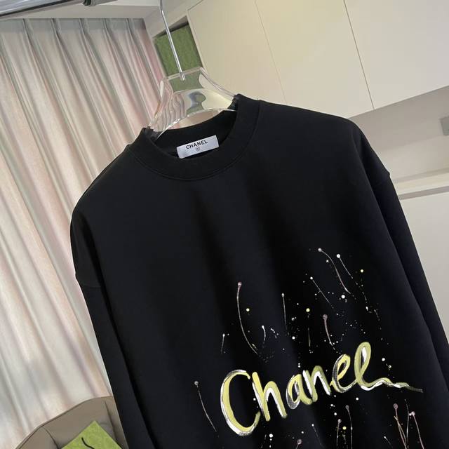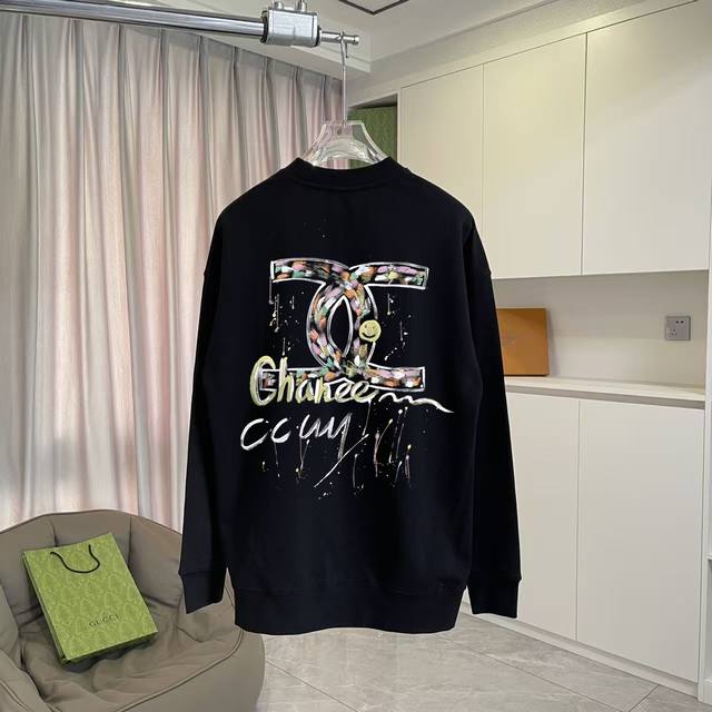 Chanel 2025 Fall/Winter New Arrival Double C Logo Print Custom Fabric 400G Crew Neck Sweatshirt Unisex Sizes: S, M, L, XL, XXL Colors: Black, White