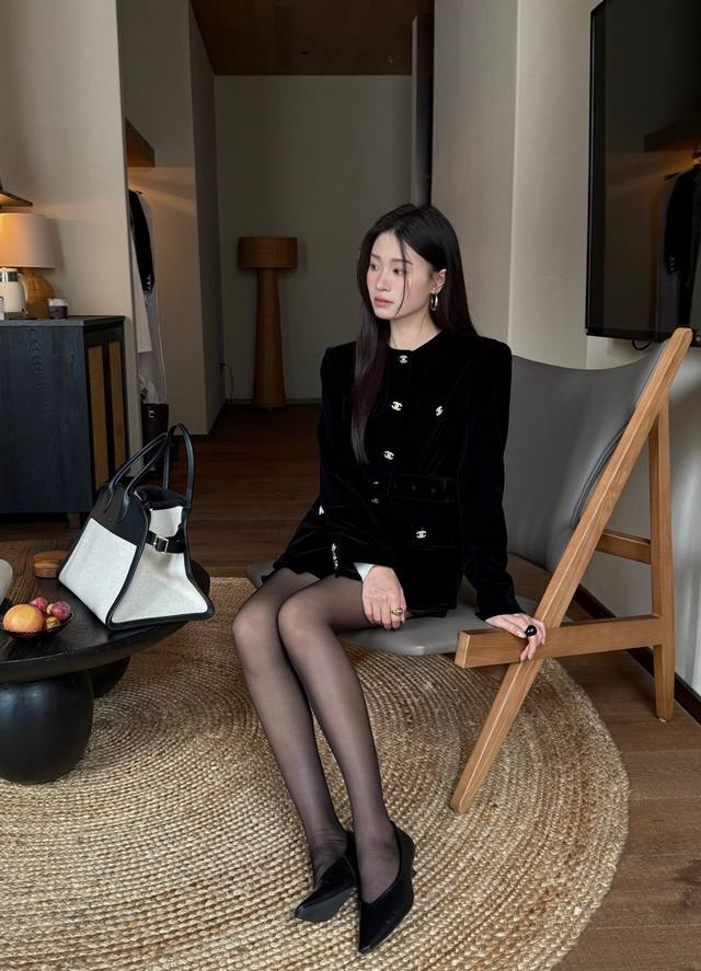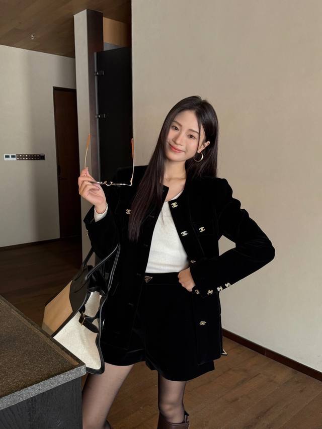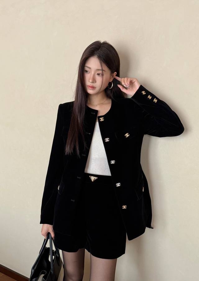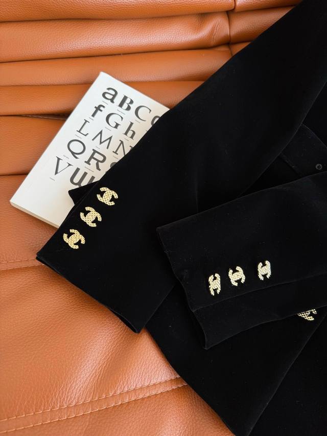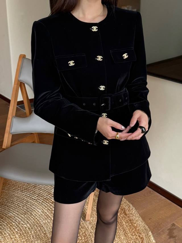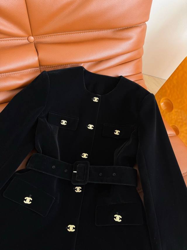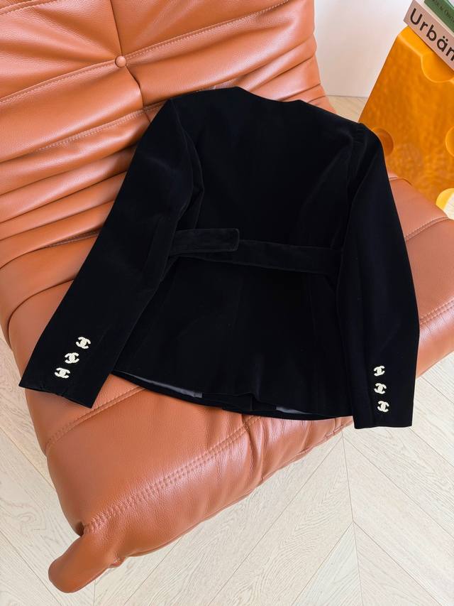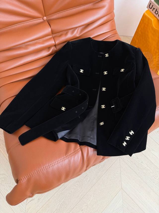 New Arrival! Chanel Mini Velvet Jacket with Double C Buttons and Belt. So sophisticated! The belted waist design easily creates a slimmer waist. Color: Black. Sizes: S, M, L. S Recommended Size: 80-100cm. M Recommended Size: 100-115cm. L Recommended Size: 115-135cm.