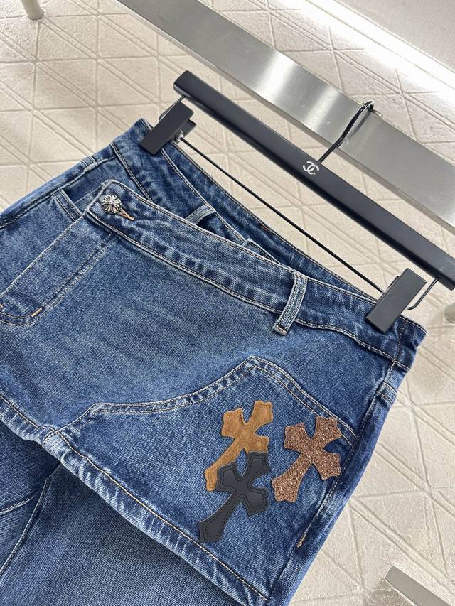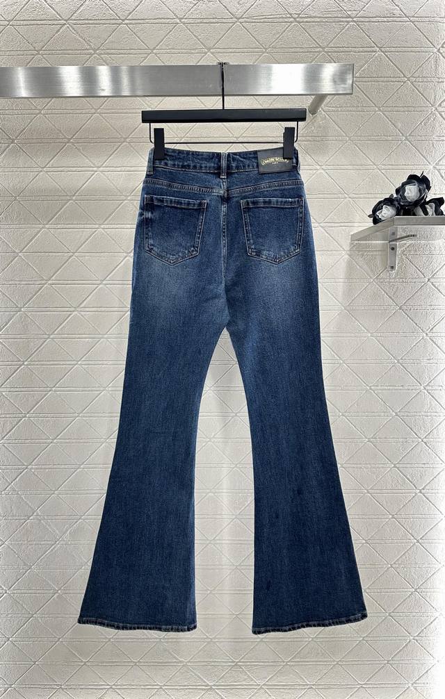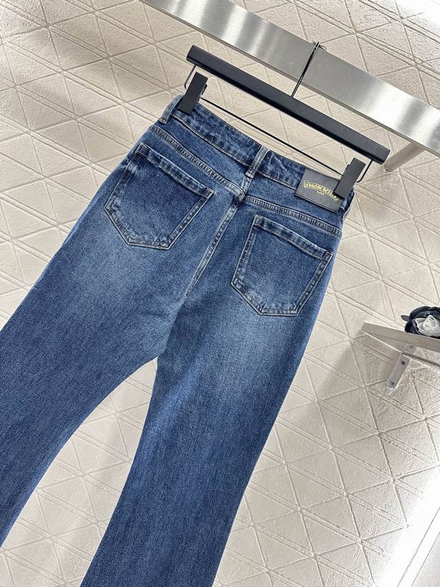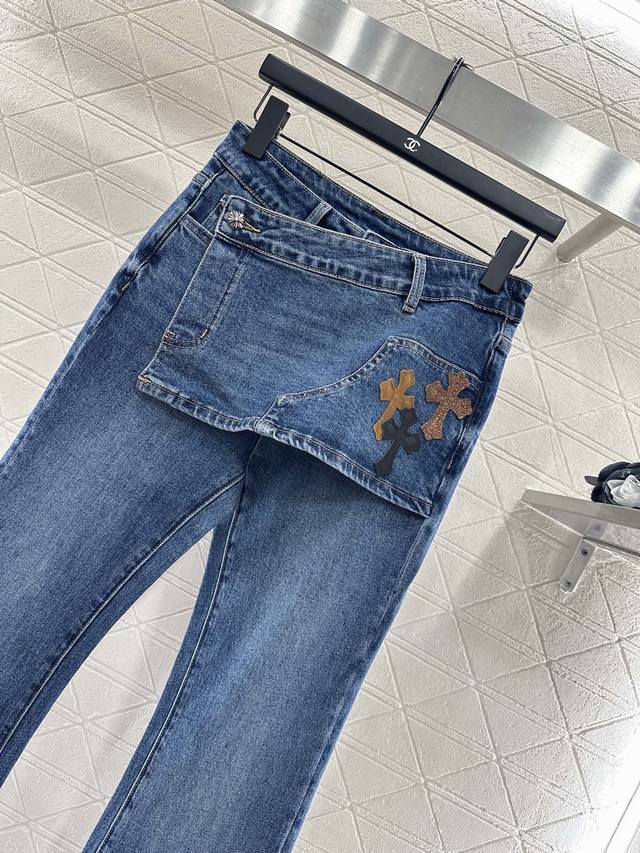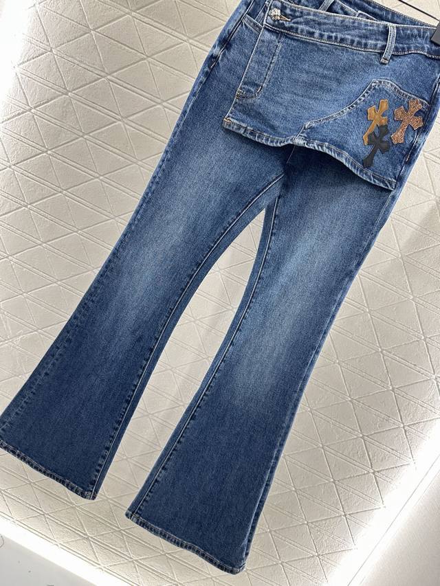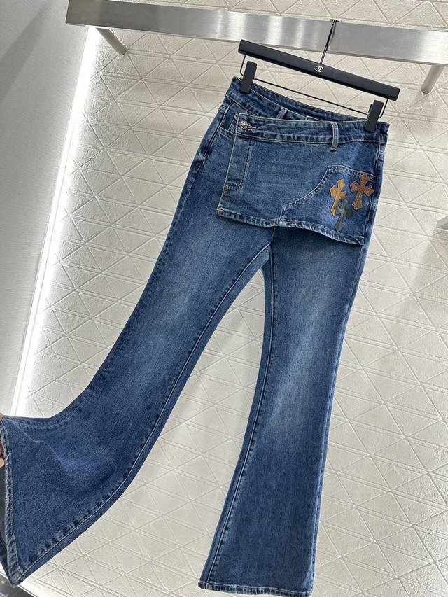 Fake Two-Piece Skirted Denim Pants. Custom Yb twill cotton denim, comfortable, crisp, and stylish. Buttoned, slightly flared trousers with a faux two-piece design. A single layer of coverage complements the hem. A totem cross logo print echoes the back of the waist. This brand positioning highlights the brand's fashionable design and exudes a sense of modernity. The trouser legs are double-washed and bleached for a stylish and sophisticated look. The slightly flared silhouette flatters the leg shape, adding a casual and stylish touch. Custom-made fabrics and accessories are available. Look for the highest quality version.