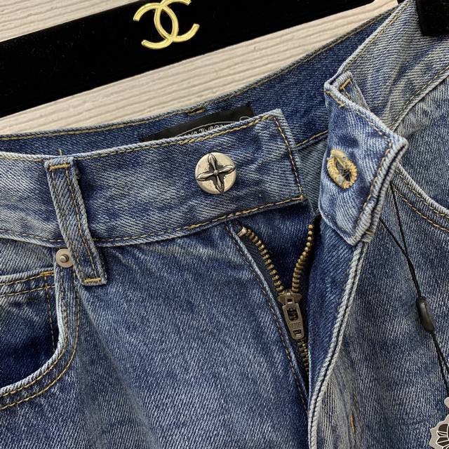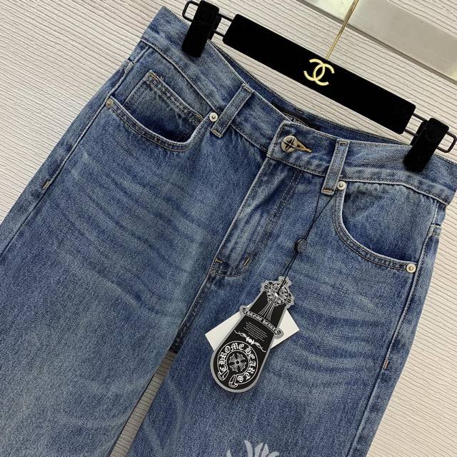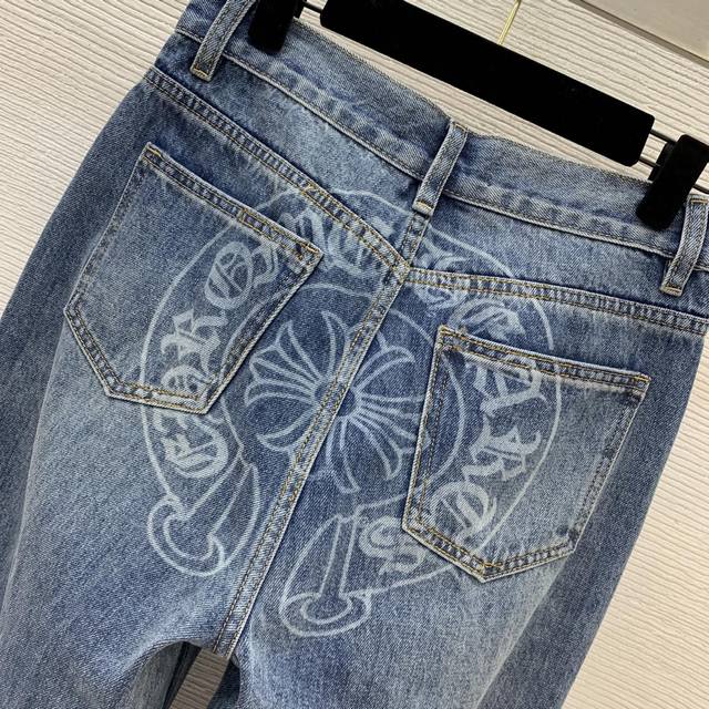 Chrome Hearts *New High-End Custom Washed Denim Cotton Fabric, Classic Cross Print, Large Logo Badge on the Back, Loose and Versatile Wide-Leg Jeans! Size M: Waist 70cm (No Stretch), Length 105cm DDD