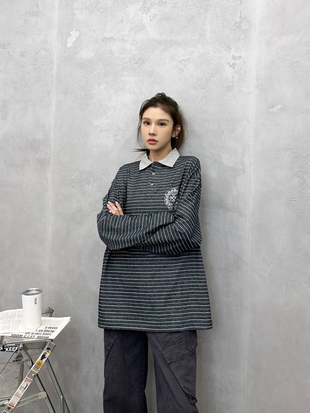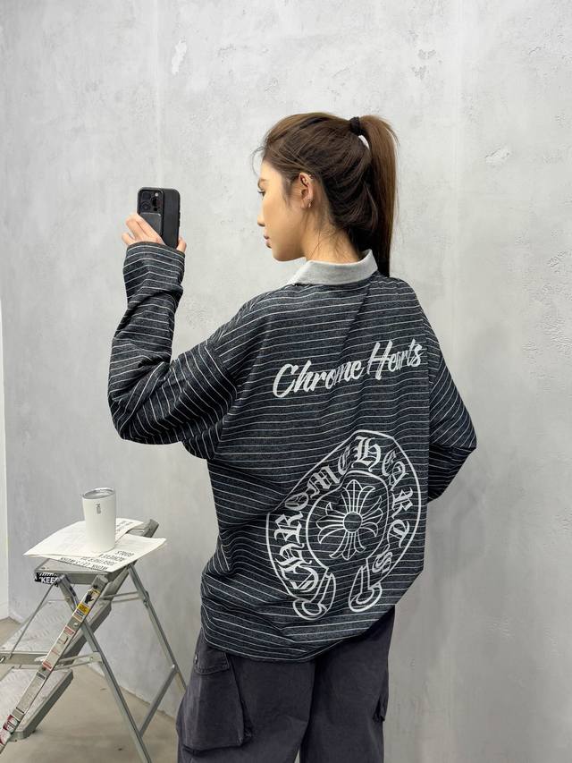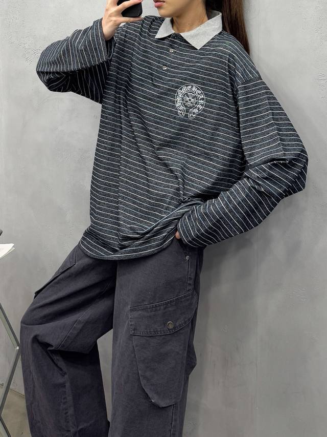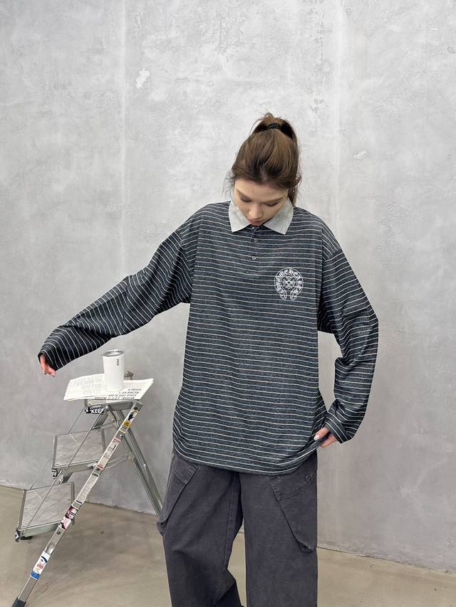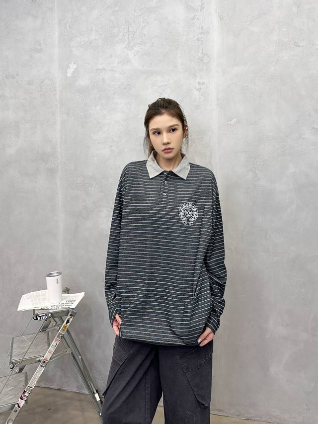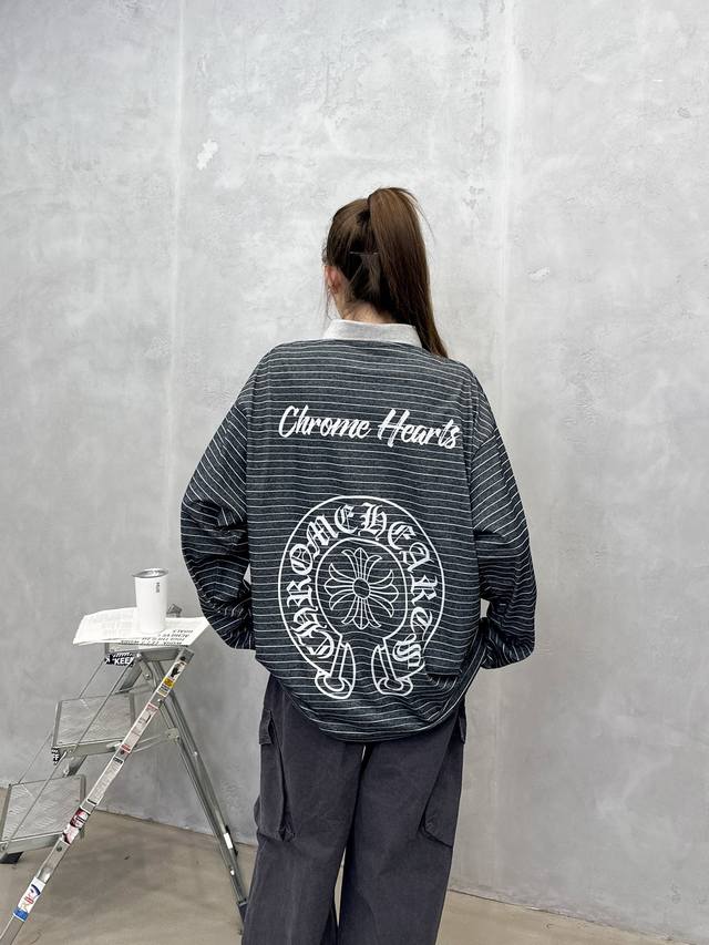 Chrome Hearts | New Long-Sleeve T-Shirt, Garment Wash and Print Process, Polo Style Design, Special Striped Fabric, Unisex, Sizes S, M, L, DDD