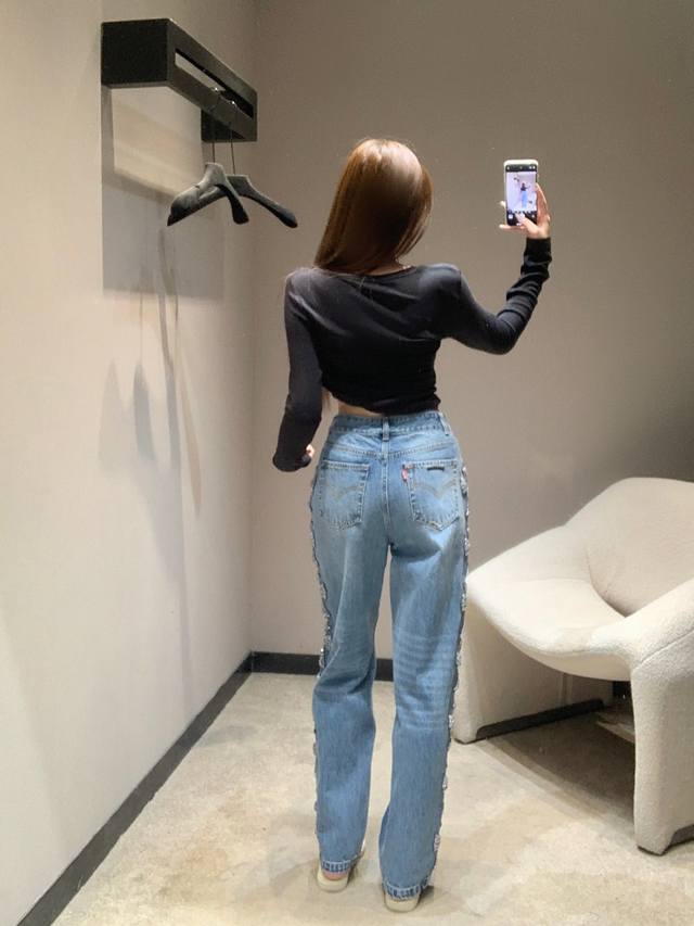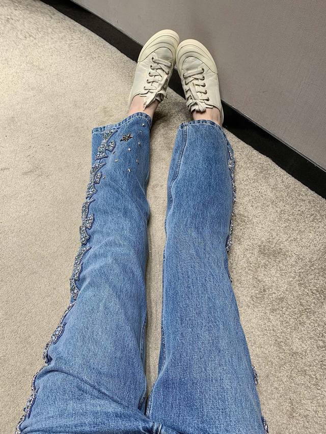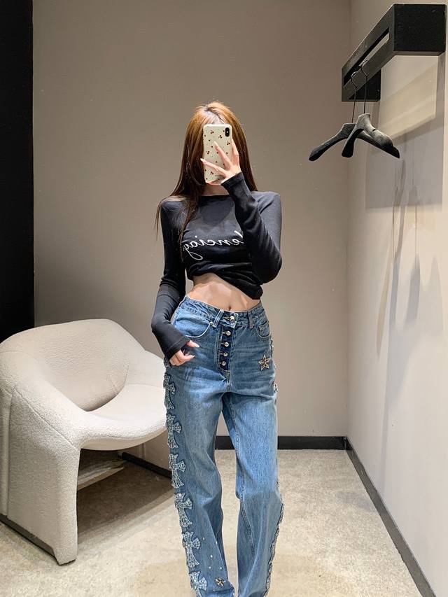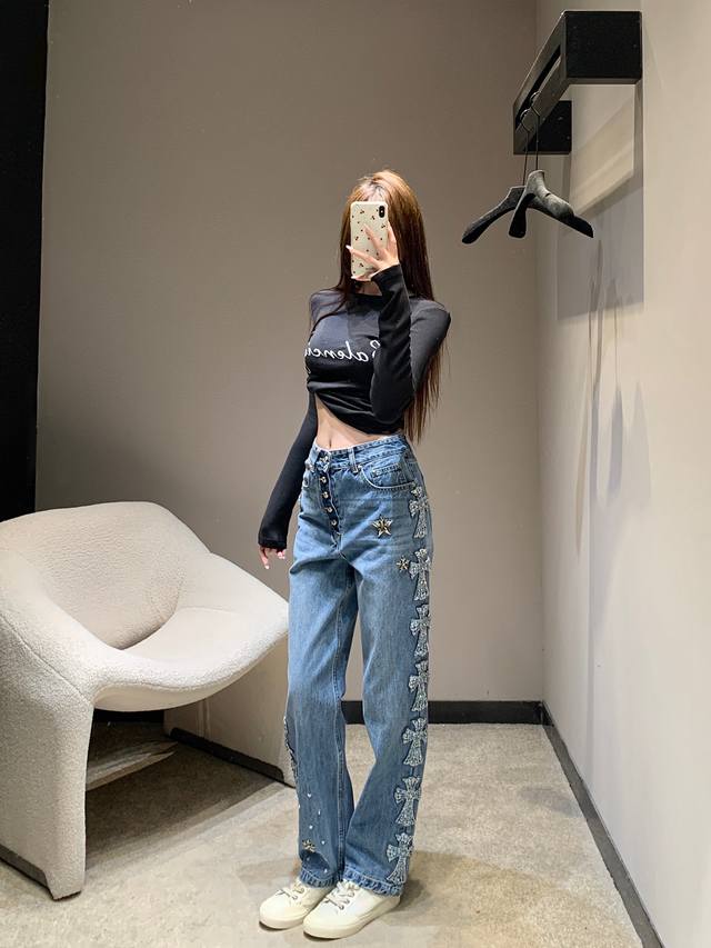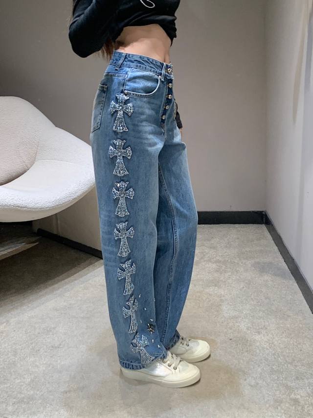 Chrome He*Rts 25Fw Autumn/Winter New Cannes Limited Edition Denim Pants | Exclusive Yb Development! Top-Tier High-Quality Production! Based on classic washed denim, the sides are adorned with the brand's signature silver cross embellishments and rhinestone embroidery, while starburst metallic decorations adorn the waistband, perfectly blending street punk with high-end craftsmanship. The relaxed straight-leg fit flatters various body types, and the rarity of being a Cannes exclusive adds to its collectible value, making it a hardcore trendy luxury item that showcases individuality. Available now in sizes S, M, L, D.D.