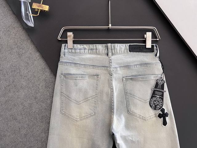 Ch Chrome Hearts* Summer hit, impeccably crafted. Classic casual stretch jeans with a low-key luxury feel and custom leather patch and hardware. A year-round bestseller. Continuously refined, this style demonstrates unwavering dedication to quality and taste. This classic pair is easy to style for both business and casual wear, enhancing the overall aesthetic. The minimalist, elegant, and stylish lines of the jeans are complemented by a tapered cuff that contours to the curve of the leg. Sizes: 28-38, no 37.