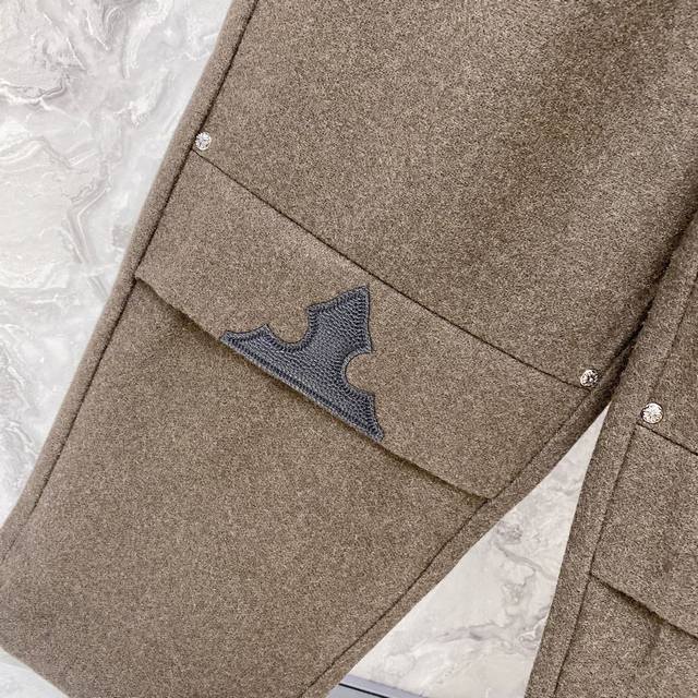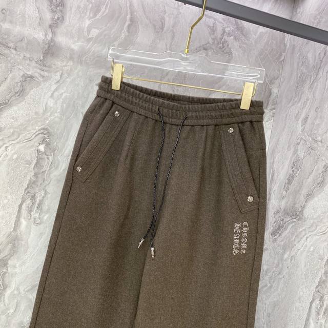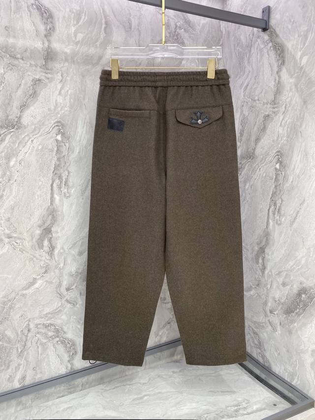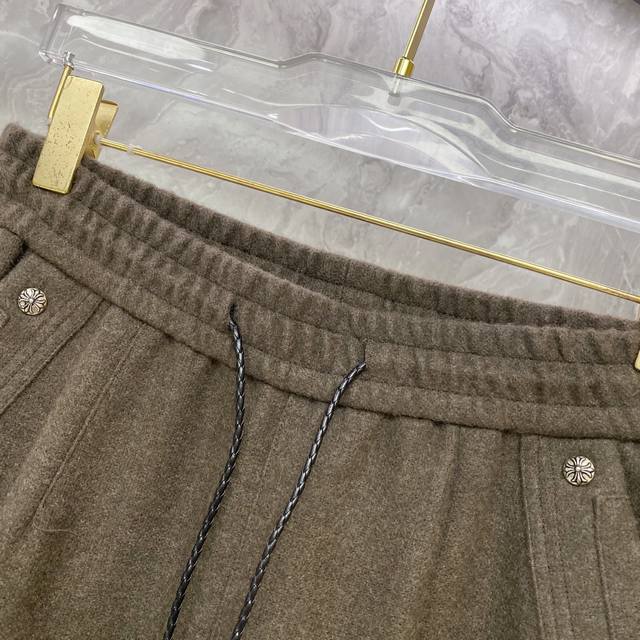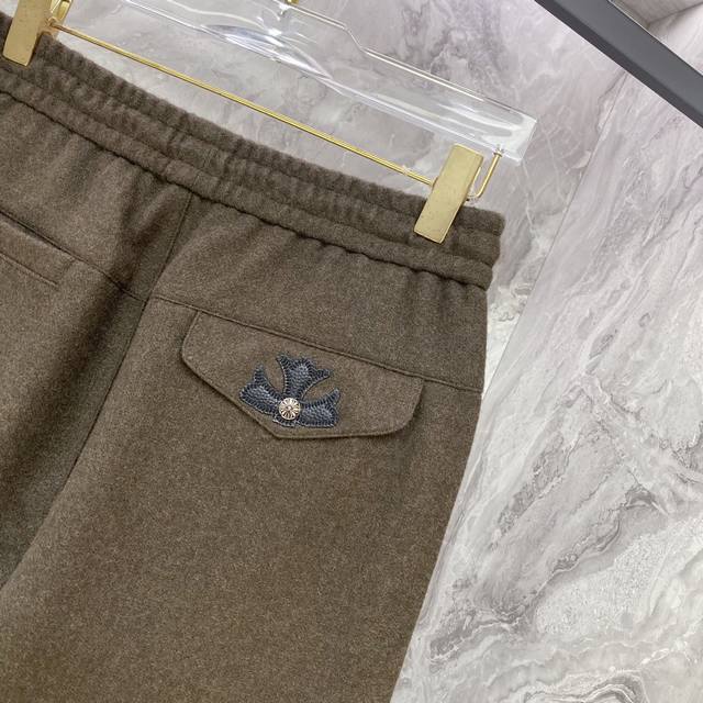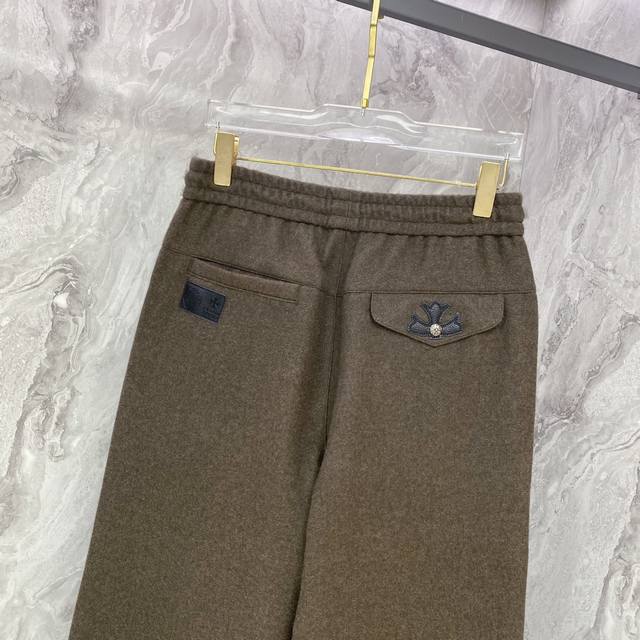 Chrome Hearts 25th Anniversary Winter New Wool Trousers (Ddd) Custom cross leather trim, custom Chrome Hearts hardware, loose and relaxed fit, versatile and flattering for all body types. Made of calfskin leather with multiple color-fixing treatments! (Ddd) Color: Brownish-green (Ddd) Sizes: 48-56 (DDD)