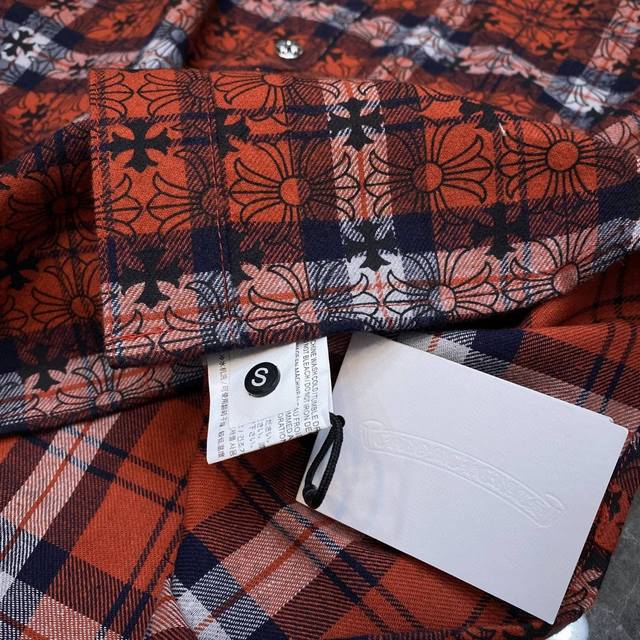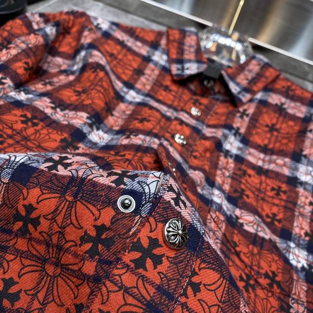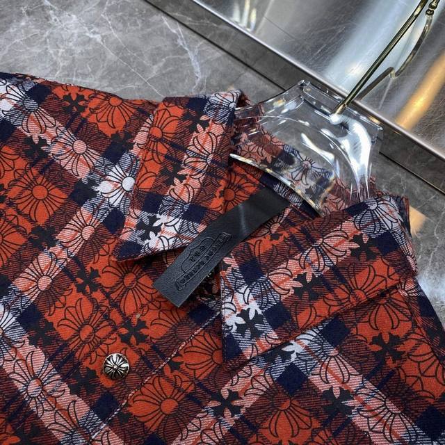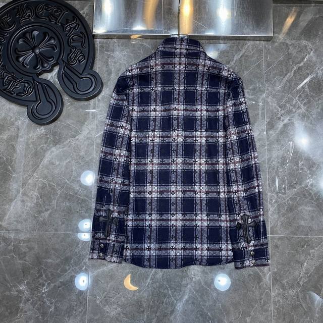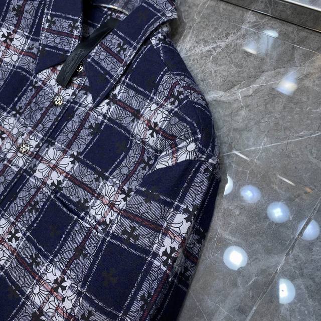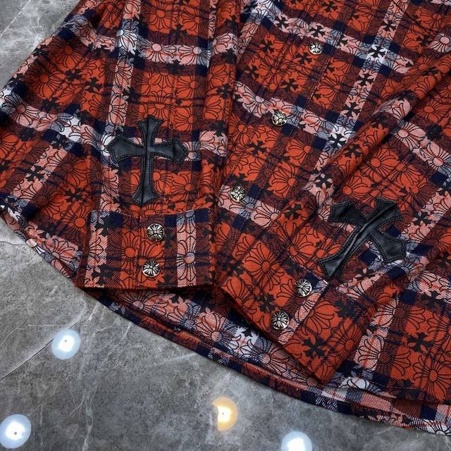 8108# New Arrival: Chrome Hearts Spring Shirt Collection. Classic Spring Patchwork Leather Shirt with Full Cross Pattern and Silver Buttons. All-over plaid with matching cuffs and sheepskin trim. Original mold, custom-made antique bronze silver snap buttons. Specially customized high-weight original shirt fabric. A must-have for layering, wearing alone, or as an outer layer. Recommended Colors: Dark Blue, Red. Sizes: S, M, L, XL.