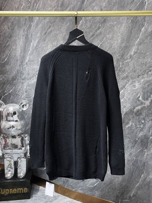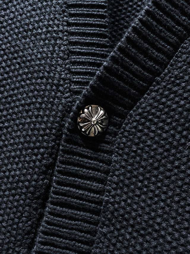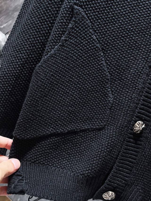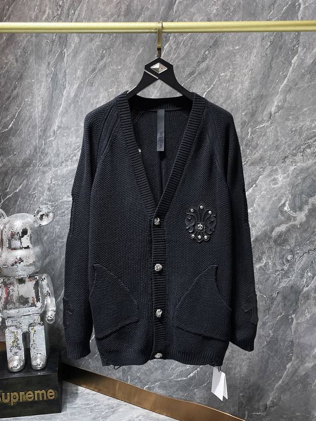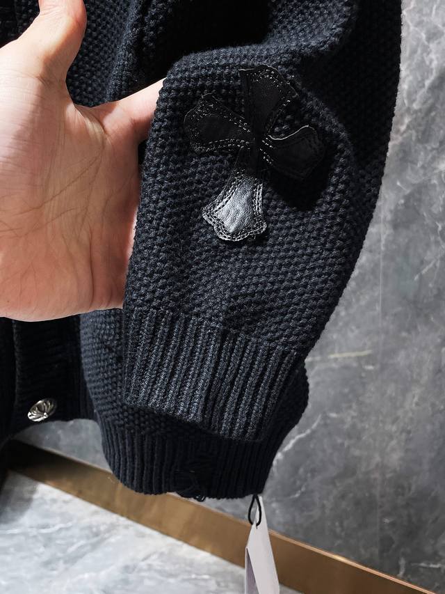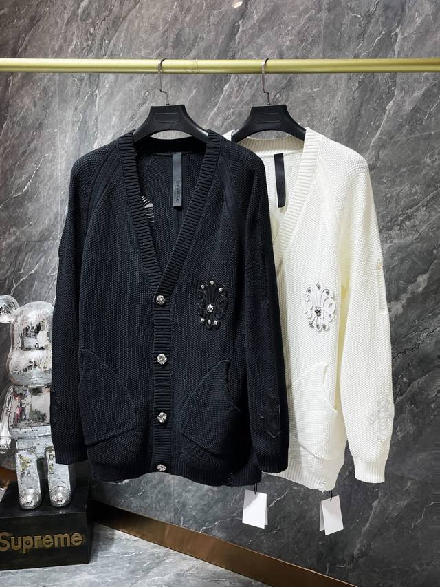 8159# New Arrival! Chrome Hearts Autumn/Winter Sweater Collection. Chrome Hearts Embroidered Ripped Loose Korean Style Sweater. Made with premium pure cotton, high-weight knit. Custom-designed Chrome Hearts hardware buttons and embroidered leather label on the chest. Uses Tajima machine embroidery technology, unlike ordinary versions on the market. A must-have for fashionable high-street men and women. Recommended Colors: Black, White. Sizes: S, M, L, XL.