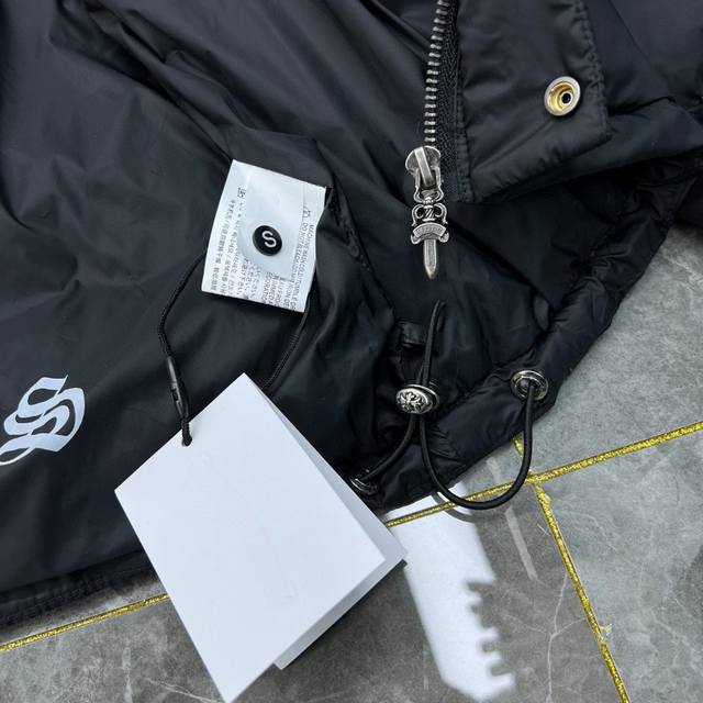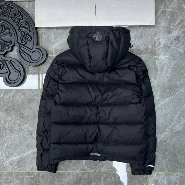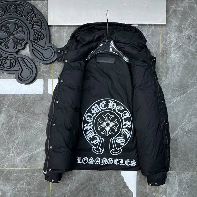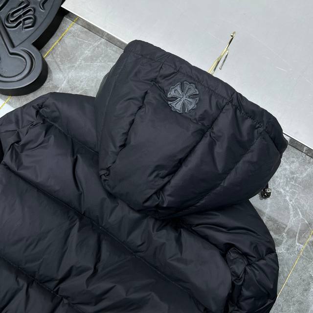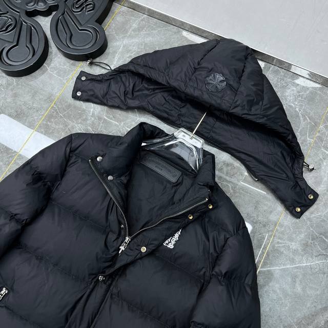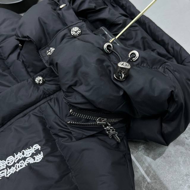 8361# New Arrival! Chrome Hearts Winter Down Jacket Series. Chrome Hearts Sanskrit Embroidery Series Hooded Down Jacket. Available simultaneously with department stores. Detachable hood, reversible design. Made with the best quality 90% down (Guangdong Inspection and Quarantine Standard) on the market! World's highest fill power 900D! Super abundant high-standard down filling! External windproof and waterproof custom fabric. Internal high-grade frosted lining to prevent down leakage. Original hardware, Tajima machine molding, and embroidered leather. Suitable for both casual and formal wear, stylish and slim fit without being bulky. Recommended color: Custom frosted black series. Sizes: S, M, L, XL.