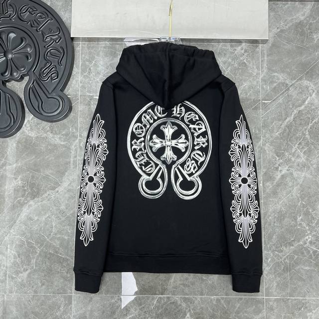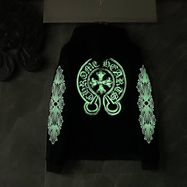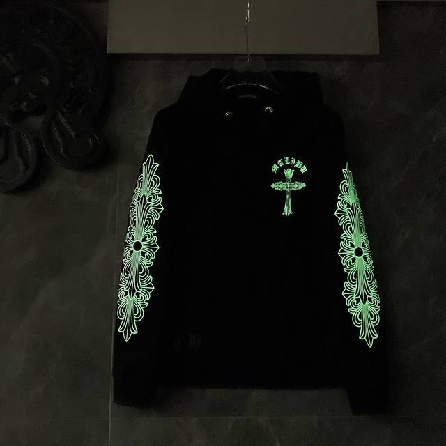8617# New Arrival: Glow-in-the-Dark Chrome Hearts Autumn/Winter 2025 Collection, Same Style as in Department Stores. Glow-in-the-Dark Hooded Sweatshirt with Hand-painted Horseshoe Graffiti. Improved Custom Version, 1:1 High-Quality Fabric. Recommended Color: Black. Sizes: S, M, L, XL.