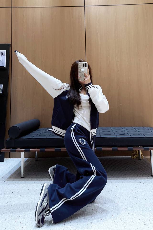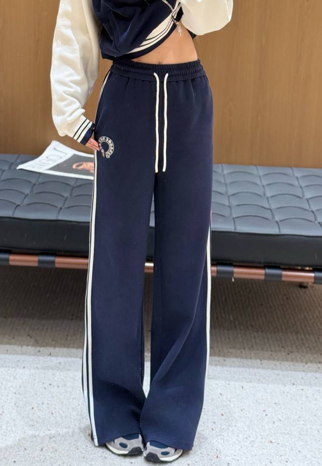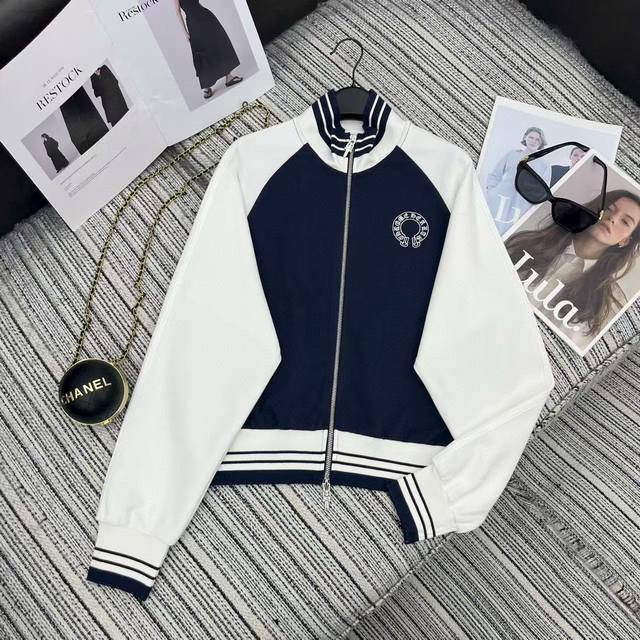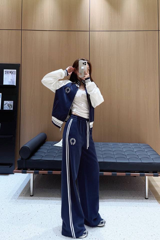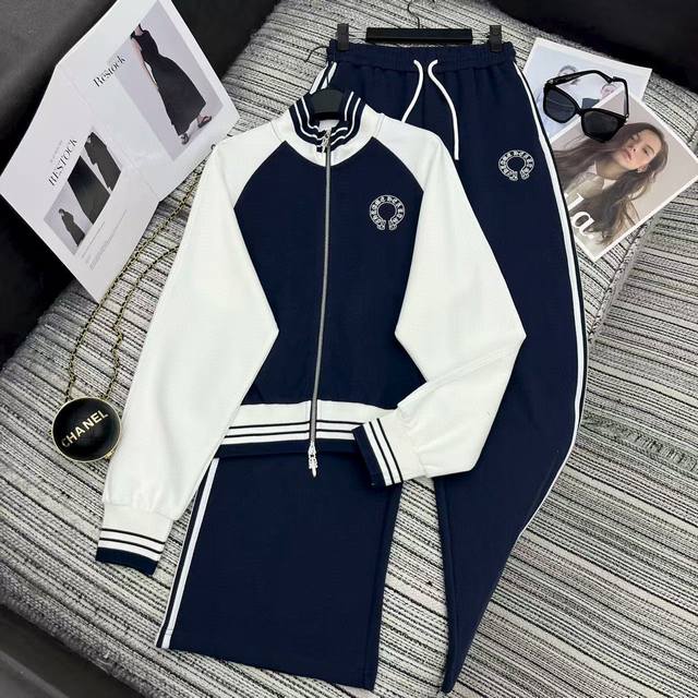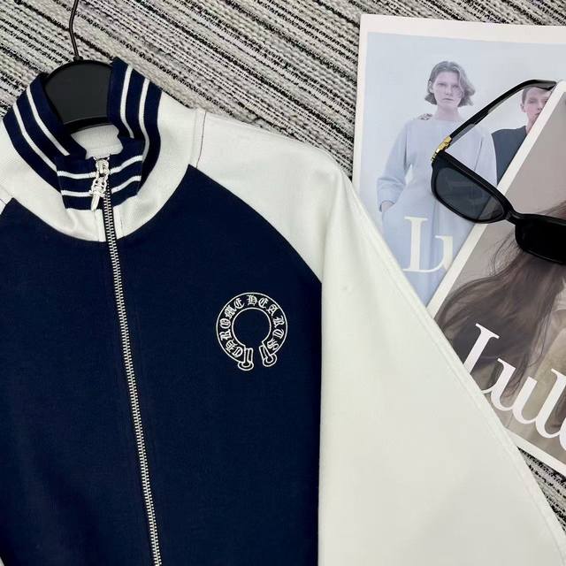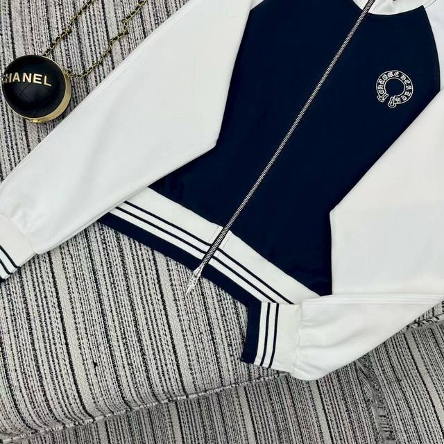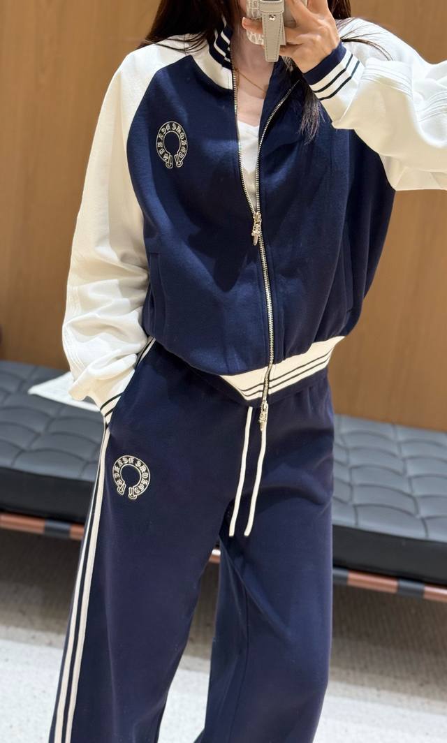 Ch Chrome Hearts* contrast color stand collar zipper sweatshirt with elastic waist straight pants set with embroidered logo embellishment