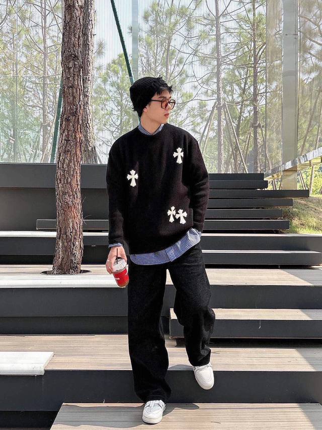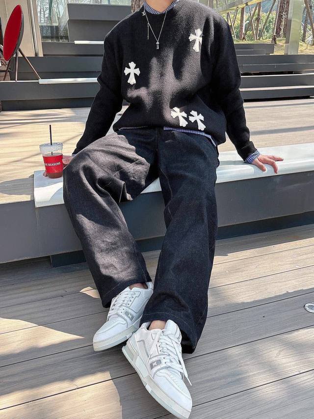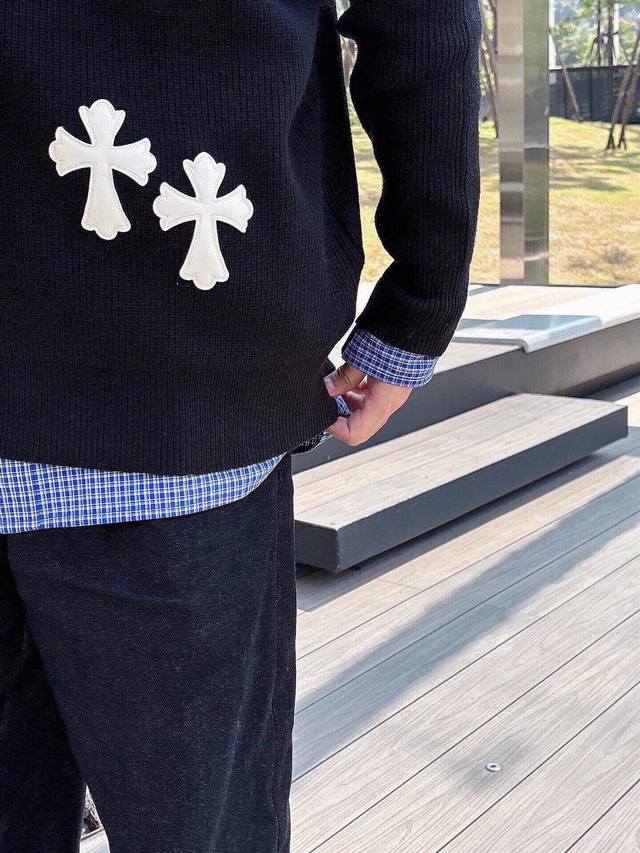 Ch Chrome Hearts, High-End Customization! Chunky Knit Crew Neck Sweater with Leather Trim. The fabric is soft and comfortable with no itching against the skin. The loose, comfortable, and stylish fit provides warmth and a high-end feel. Its quality easily surpasses all other versions on the market. You'll absolutely love it when you receive it; the feel against the skin is incredibly realistic! The iconic brand logo decoration on the chest features a detailed and clear pattern, showcasing exquisite craftsmanship and exuding charm and luxury. It's incredibly fashionable! This super versatile and durable knit sweater is very stylish and youthful, perfectly suited for all ages and genders, and flattering for any body type. Whether worn alone or as a base layer, it's extremely eye-catching, making you the center of attention with ease! Colors: Black, White Sizes: M