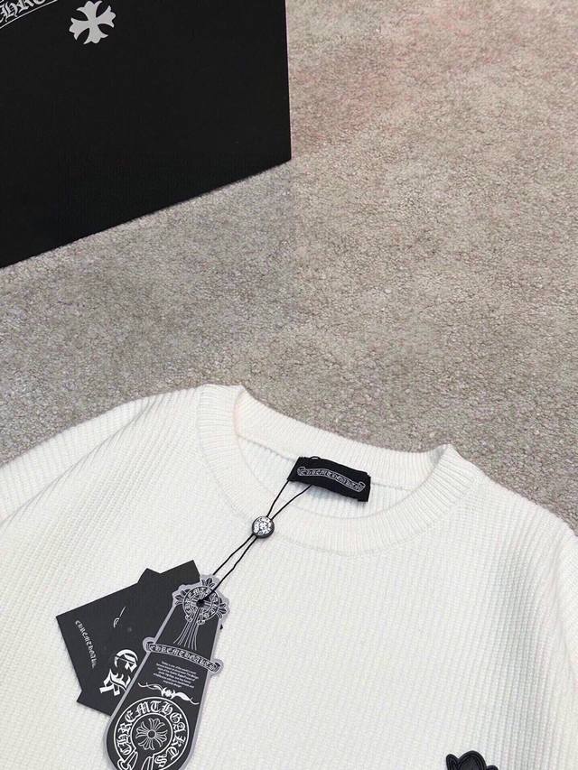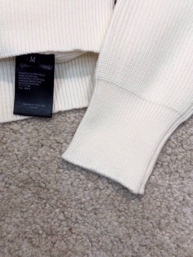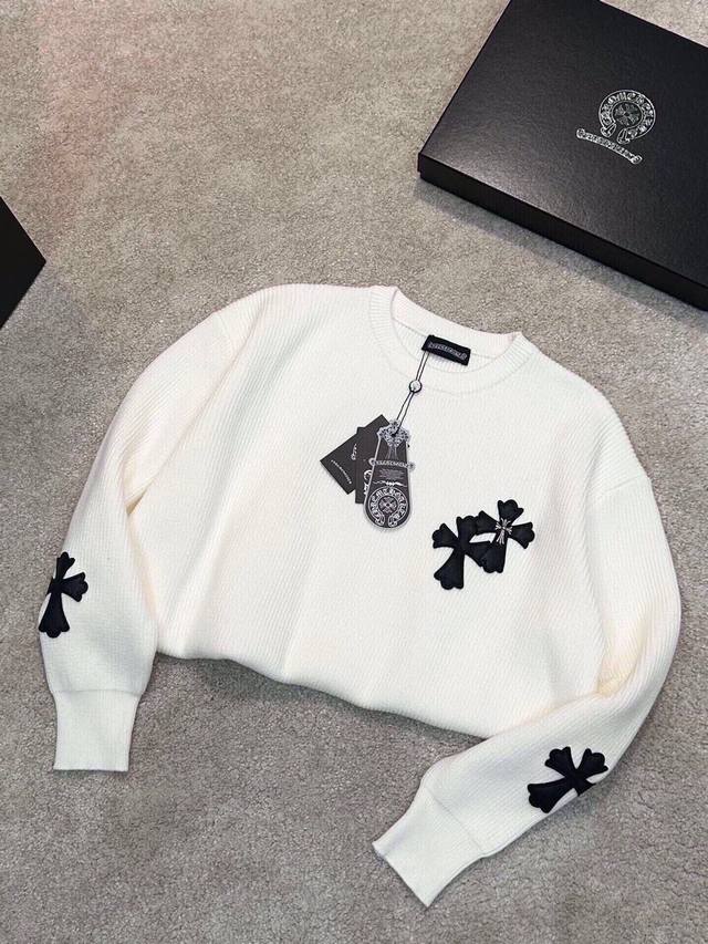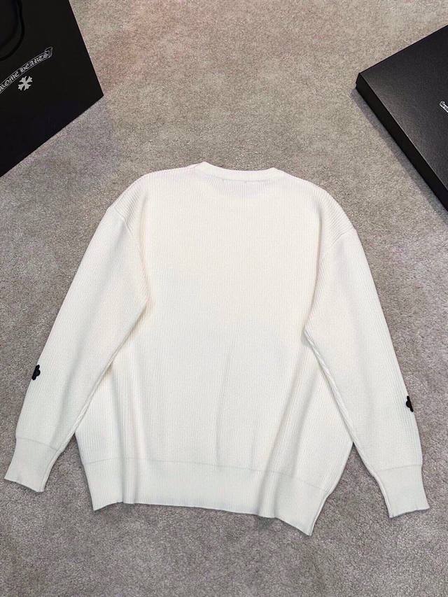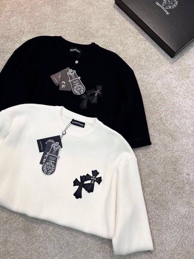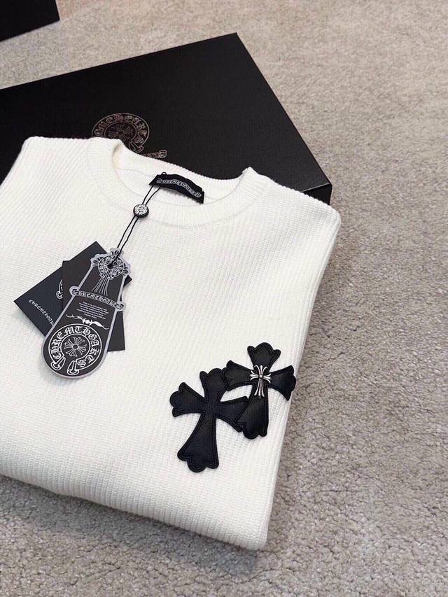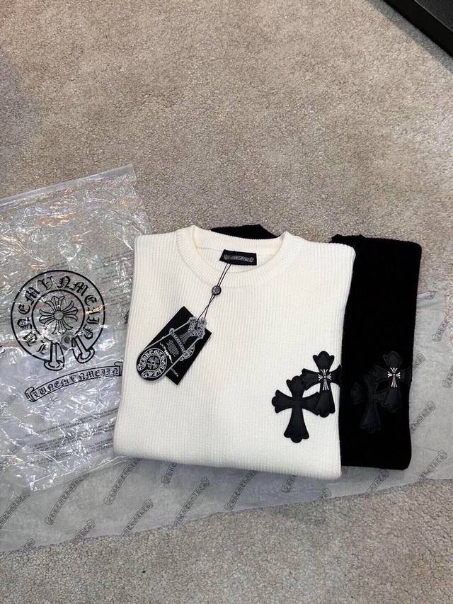 Ch Chrome Hearts, High-End Customization! Chunky Knit Crew Neck Sweater with Leather Trim. The fabric is soft and comfortable with no itching against the skin. The loose, comfortable, and stylish fit provides warmth and a high-end feel. Its quality easily surpasses all other versions on the market. You'll absolutely love it when you receive it; the feel against the skin is incredibly realistic! The iconic brand logo decoration on the chest features a detailed and clear pattern, showcasing exquisite craftsmanship and exuding charm and luxury. It's incredibly fashionable! This super versatile and durable knit sweater is very stylish and youthful, perfectly suited for all ages and genders, and flattering for any body type. Whether worn alone or as a base layer, it's extremely eye-catching, making you the center of attention effortlessly! Colors: Black, White Sizes: M
