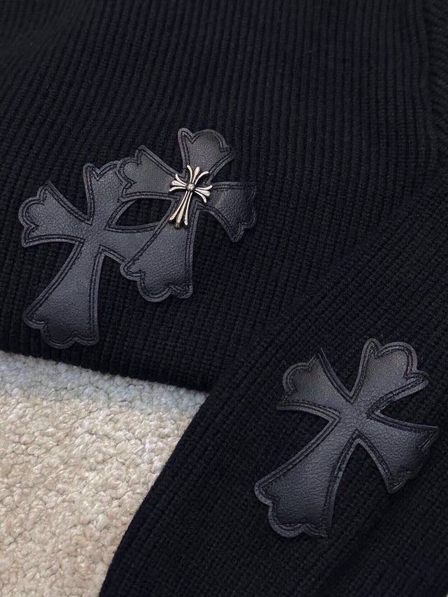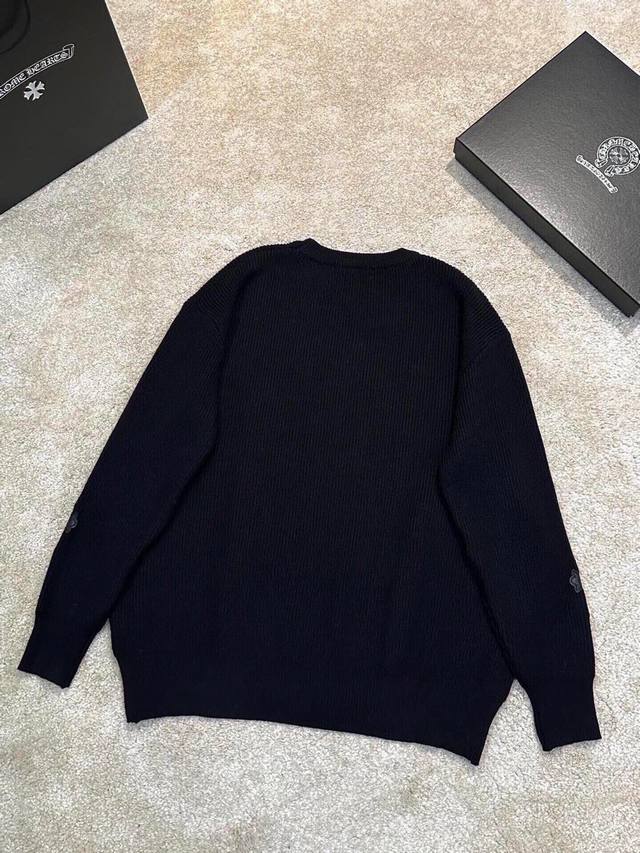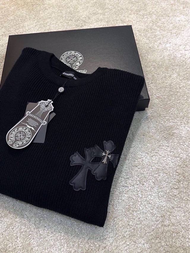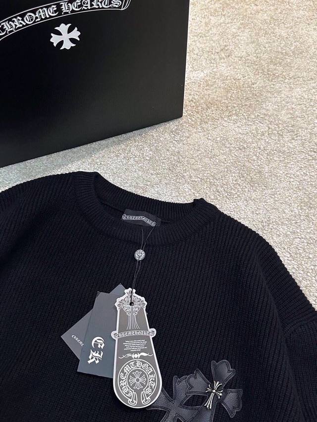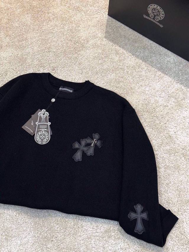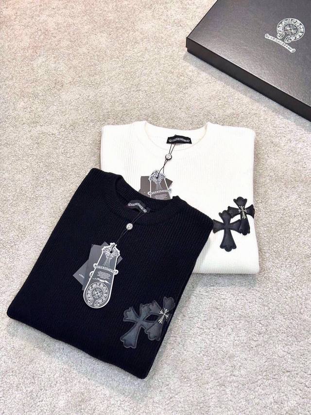 Ch Chrome Hearts, High-End Customization! Chunky Knit Crew Neck Sweater with Leather Trim. The fabric is soft and comfortable with no itching against the skin. The loose, comfortable, and stylish fit provides warmth and a high-end feel. Its quality easily surpasses all other versions on the market. You'll absolutely love it when you receive it; the feel against the skin is incredibly realistic! The iconic brand logo decoration on the chest features a detailed and clear pattern, showcasing exquisite craftsmanship and exuding charm and luxury. It's incredibly fashionable! This super versatile and durable knit sweater is very stylish and youthful, perfectly suited for all ages and genders, and flattering for any body type. Whether worn alone or as a base layer, it's extremely eye-catching, making you the center of attention with ease! Colors: Black, White Sizes: M