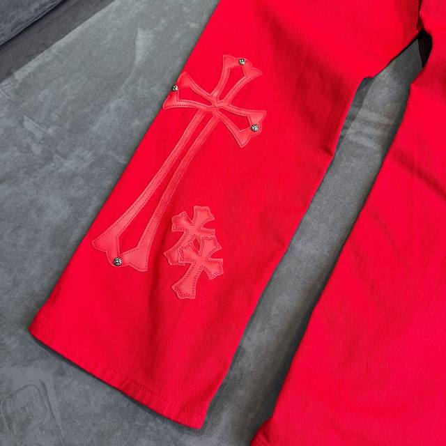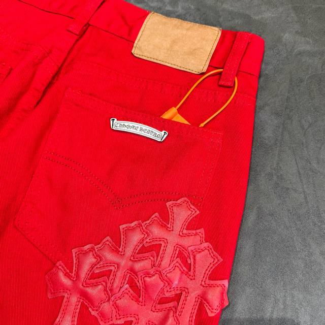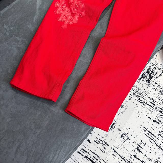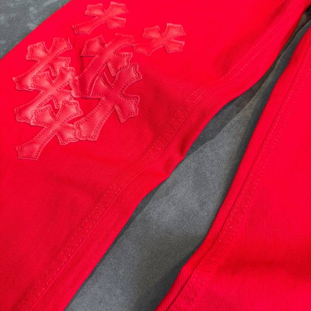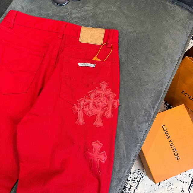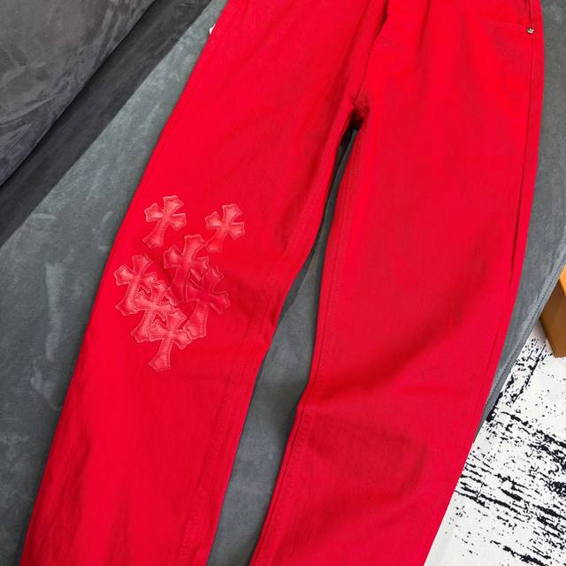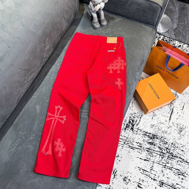 Chrome Hearts 2025 New Limited Edition Bull King Dopamine Red Large Cross Leather Couple's Washed Loose Jeans