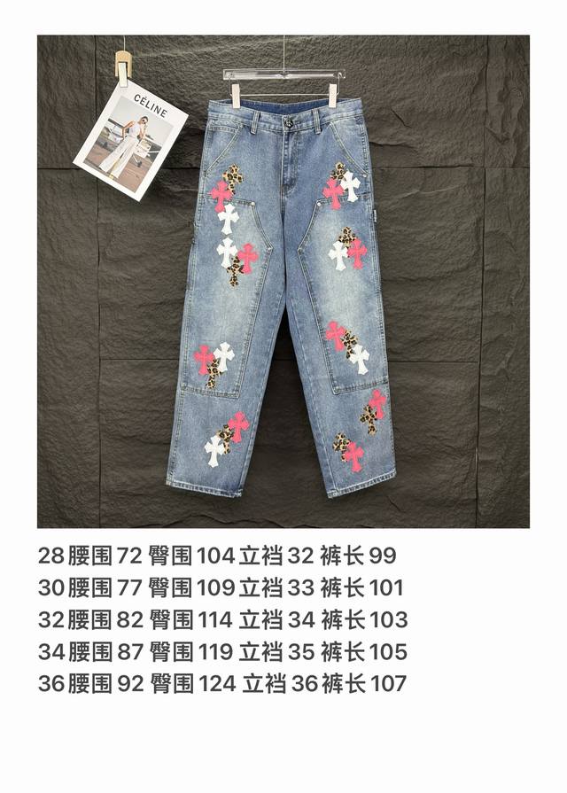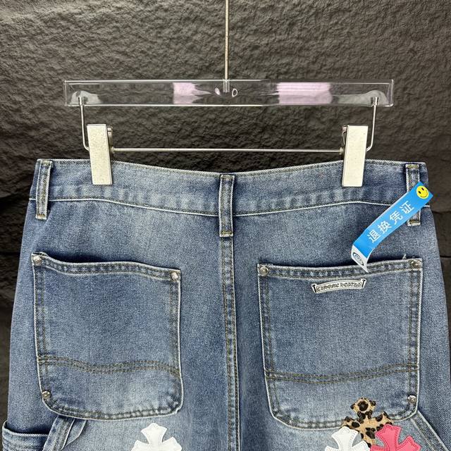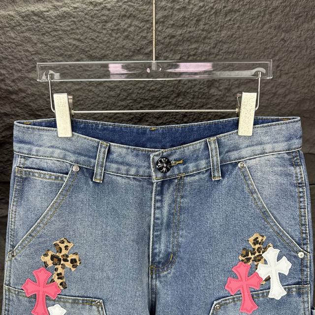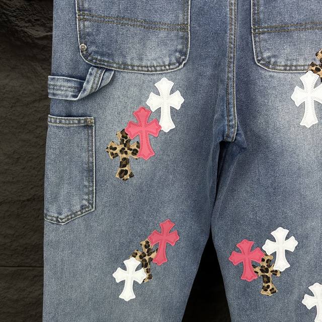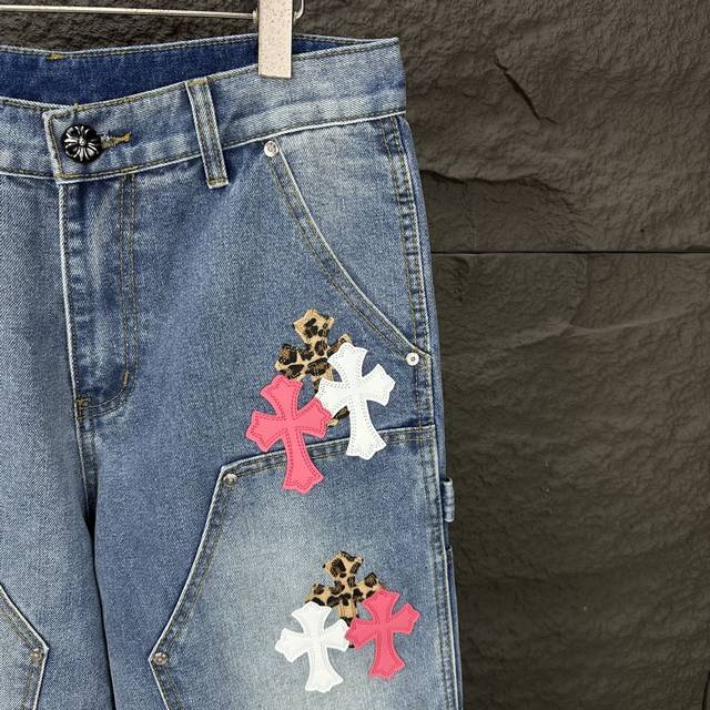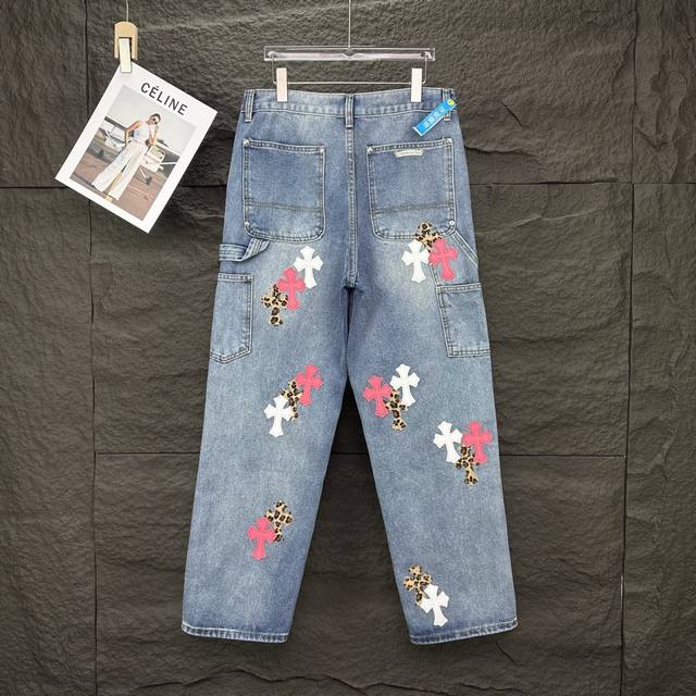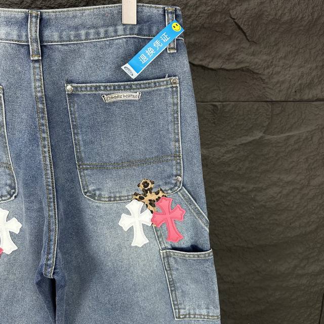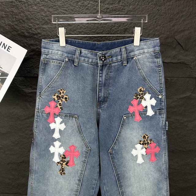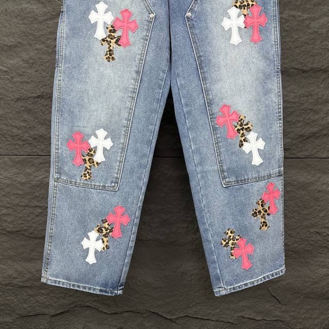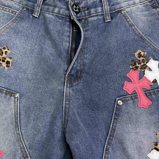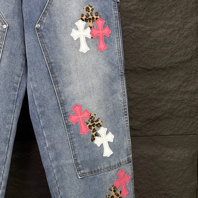 Chrome Hearts 2025 new multi-pocket lumberjack leopard print pink and white cross-leather couple washed jeans