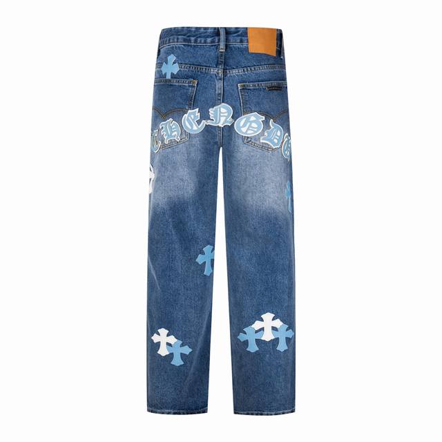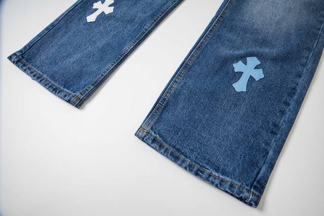 . High-waisted washed jeans with patchwork and cross-stitching embellishments!! Absolutely high-end luxury, a legendary item, incredibly popular, and crafted with top-notch craftsmanship. A street-rocker you can't miss.