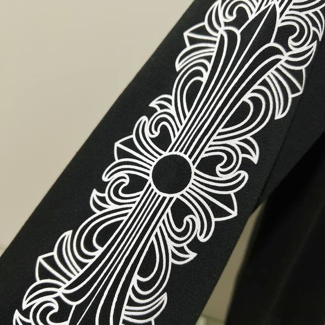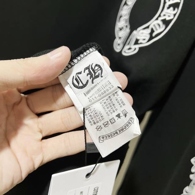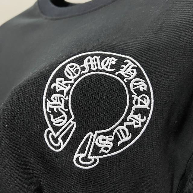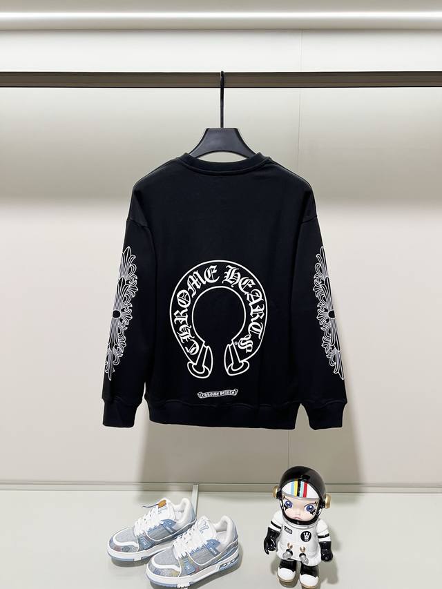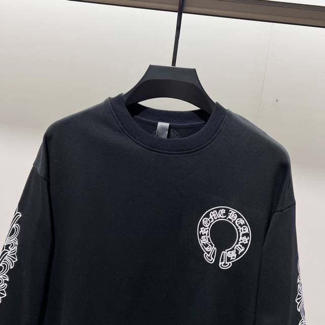 Chrome Hearts 420g 100% Cotton Crew Neck Sweatshirt. Features embroidered horseshoe and Sanskrit letter logos on the front, back, and sleeves. Officially 1:1 replica. Stylish, versatile, and trendy. Made with original quality washed fabric. Includes hangtags, neck labels, and wash labels. Colors: Black, White. Sizes: XS-L.