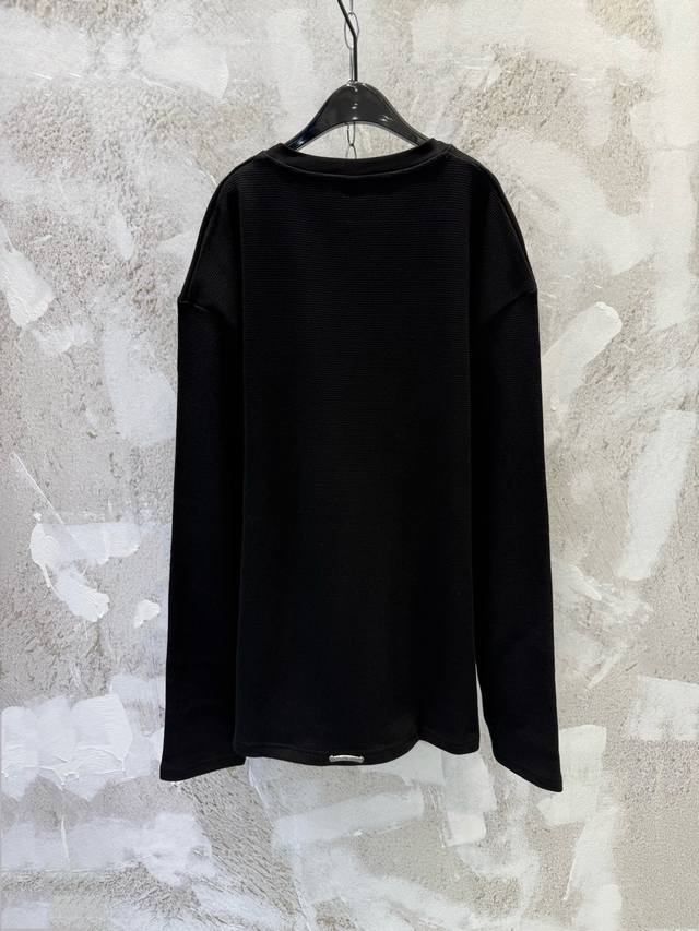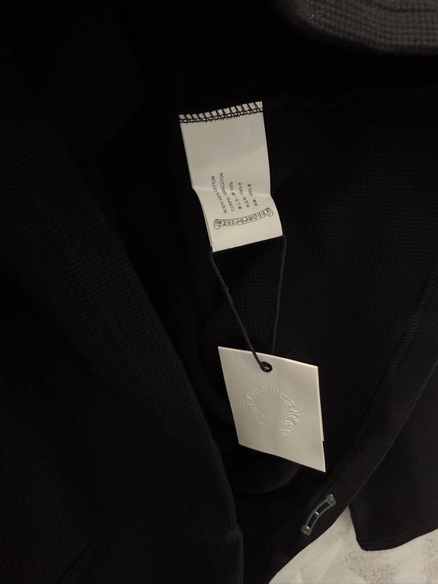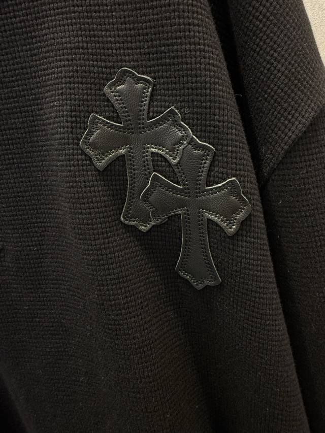 Chrome Hearts Ch 25 Patchwork Henley Collar Waffle Sweatshirt. The fabric is a 350g 100% cotton waffle double-layer material before washing, distinguishing it from low-weight, cost-cutting, and non-pure cotton market goods. The silver buttons and scroll are made of genuine antique bronze silver, reaching the quality of 300+ RMB products on the market. The leather label is made of genuine imported lambskin. Most importantly, the hand-stitched leather edges involve high costs due to the manual process. A great deal of effort has been put into the fabric and hardware craftsmanship. The highest quality in the market sets the industry standard, only available to a select few. Sizes: S, M, L.