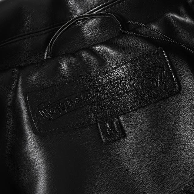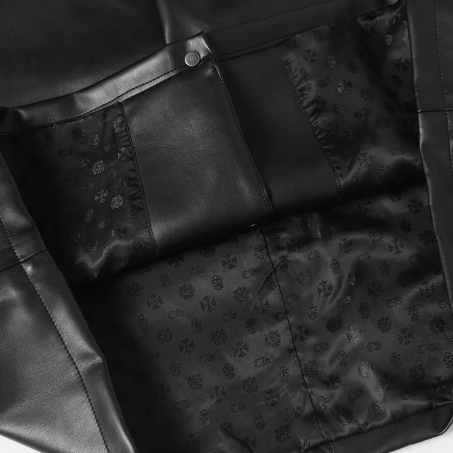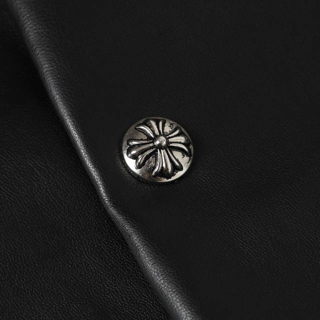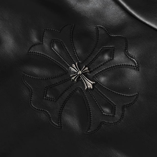 Chrome Hearts* Chrome Hearts Hardware Cross Leather Snap-Button Jacket DDD Originally purchased for 84,300. Made of black pebbled leather, with a custom silk jacquard logo lining. Embroidery is done on a Tajima machine using appliqu