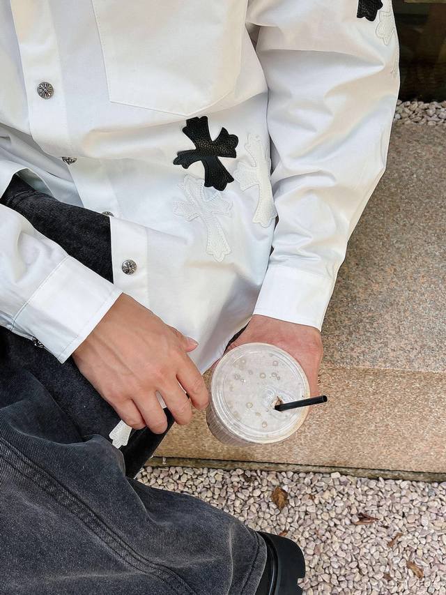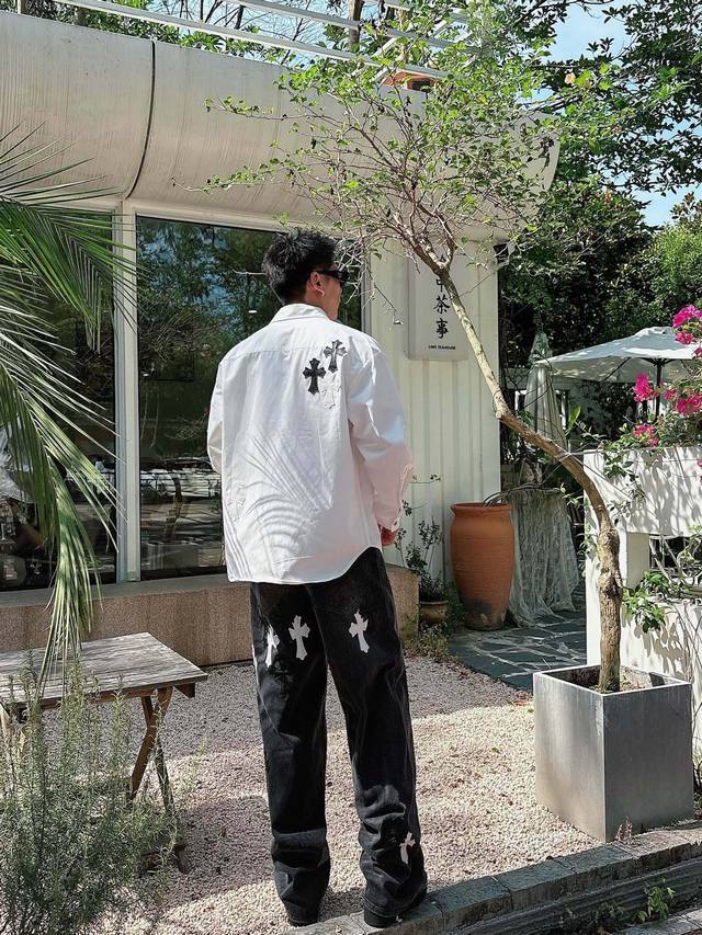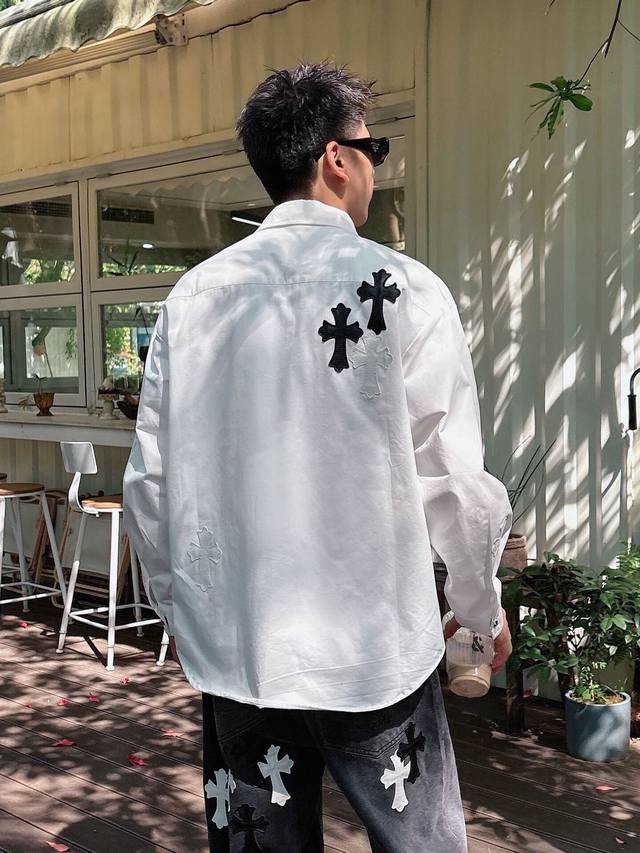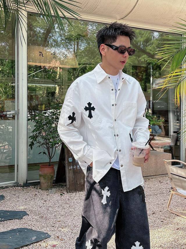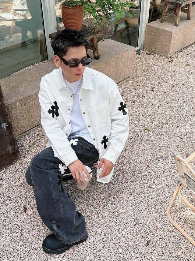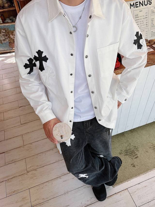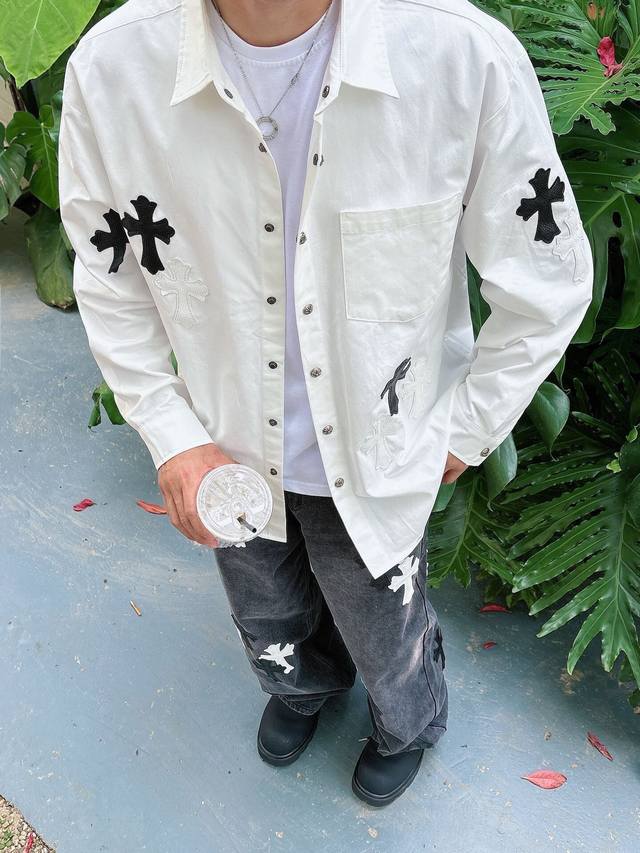 Chrome Hearts Cross-Panel Embroidered Shirt Jacket, Os Style, unisex! Made of twill cotton fabric! Clear and smooth texture, wrinkle-resistant and colorfast! The embroidery process is complex and repetitive, requiring extremely precise embroidery machines with a spacing of 45cm! Too large or too small a spacing won't work! All hardware is engraved and cast, requiring a huge amount of material