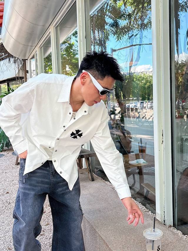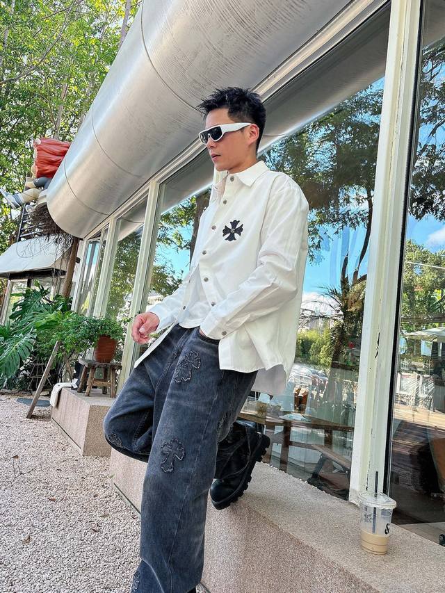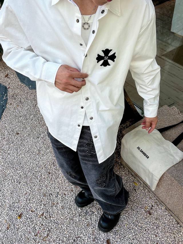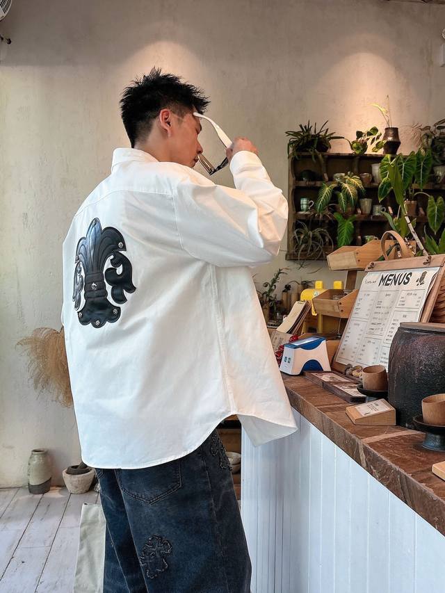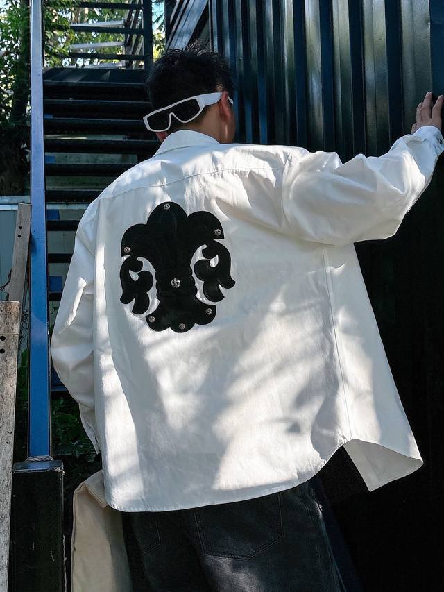 Chrome Hearts Leather Cross-Panel Embroidered Shirt Jacket, Os Style, unisex! Made of twill cotton fabric! Clear and smooth texture, wrinkle-resistant and colorfast! The embroidery process is complex and repetitive, requiring extremely precise embroidery machines with a spacing of 45cm! Too large or too small a spacing won't work! All hardware is engraved and cast, requiring a huge amount of material