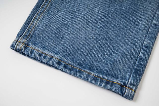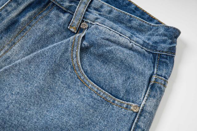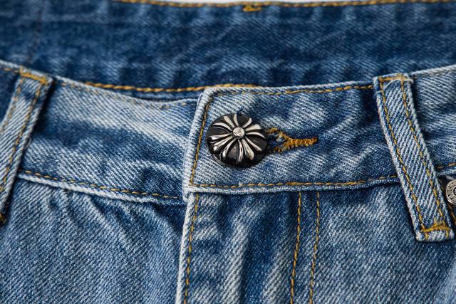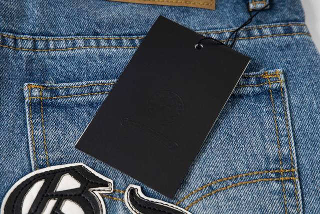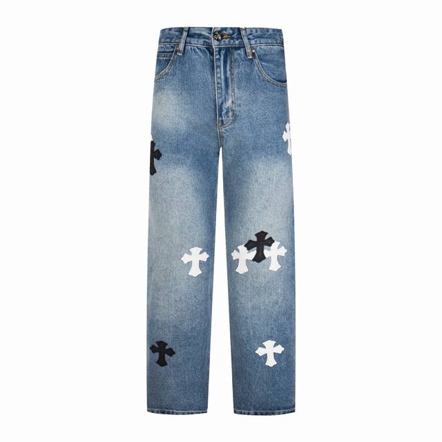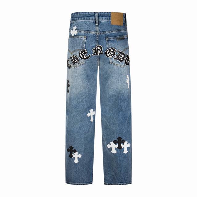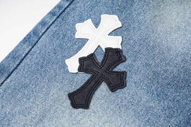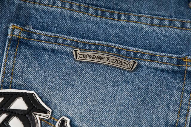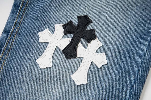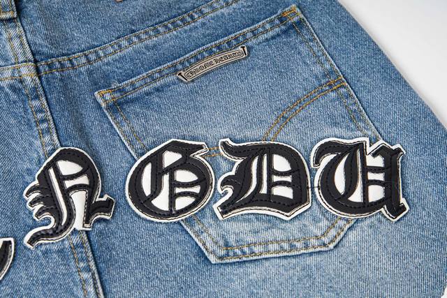 Chrome Hearts Light Blue Jeans with Sanskrit Black and White Leather Patchwork. These jeans require washing before being disassembled, hand-stitched with sheepskin cross-grain, and then reassembled. The entire process is incredibly complex. Features include cross-grain appliqu