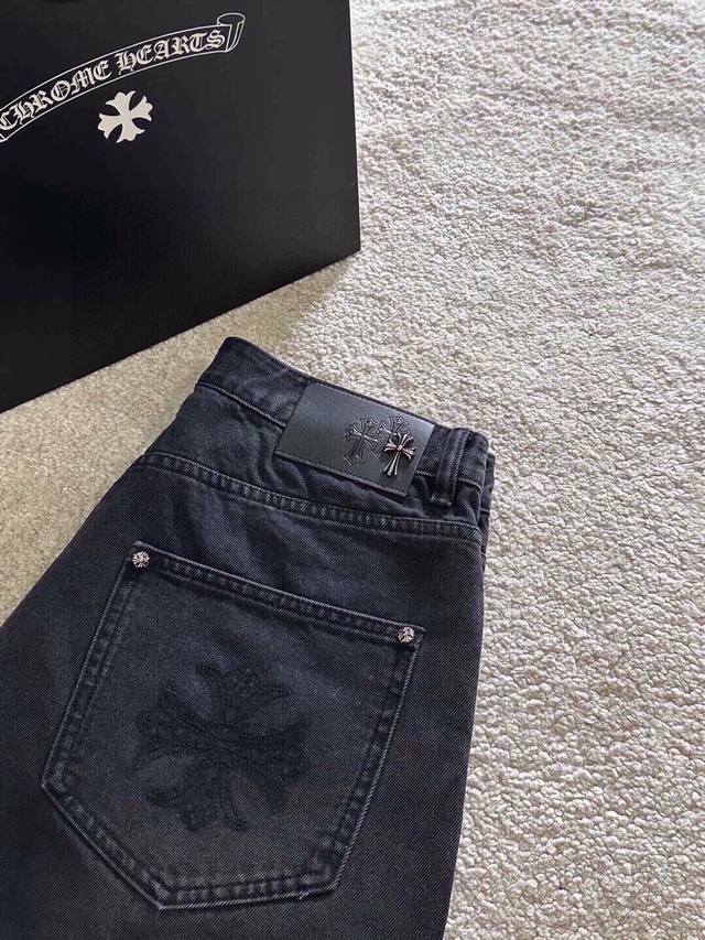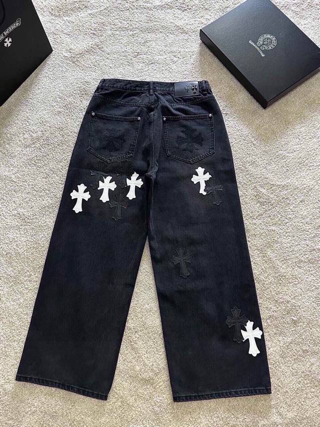 Chrome Hearts Limited Edition Black and White Patchwork Leather Washed Denim Jeans (Miami Exclusive). The entire pair of cross-stitched leather is hand-stitched