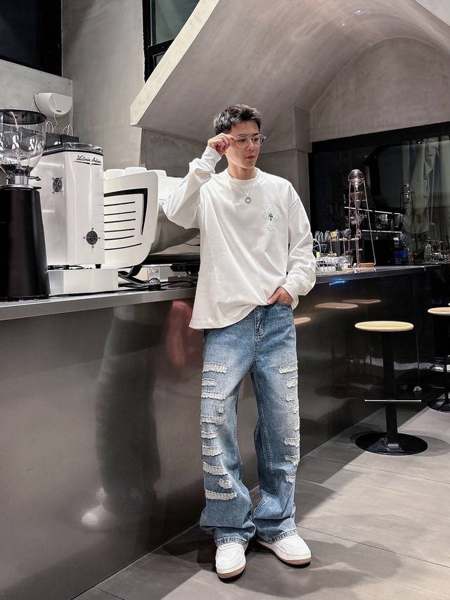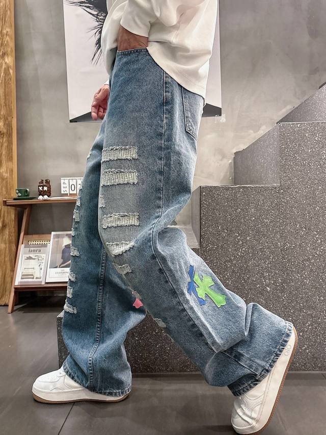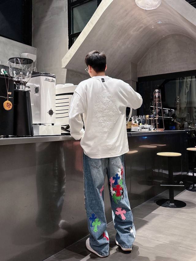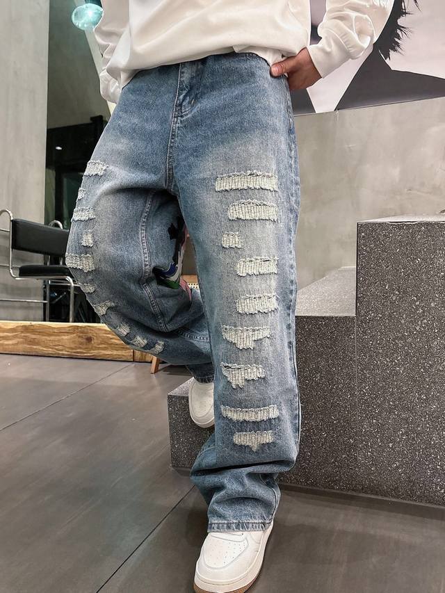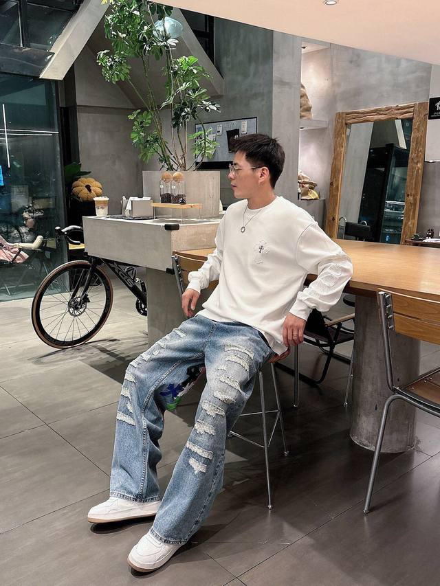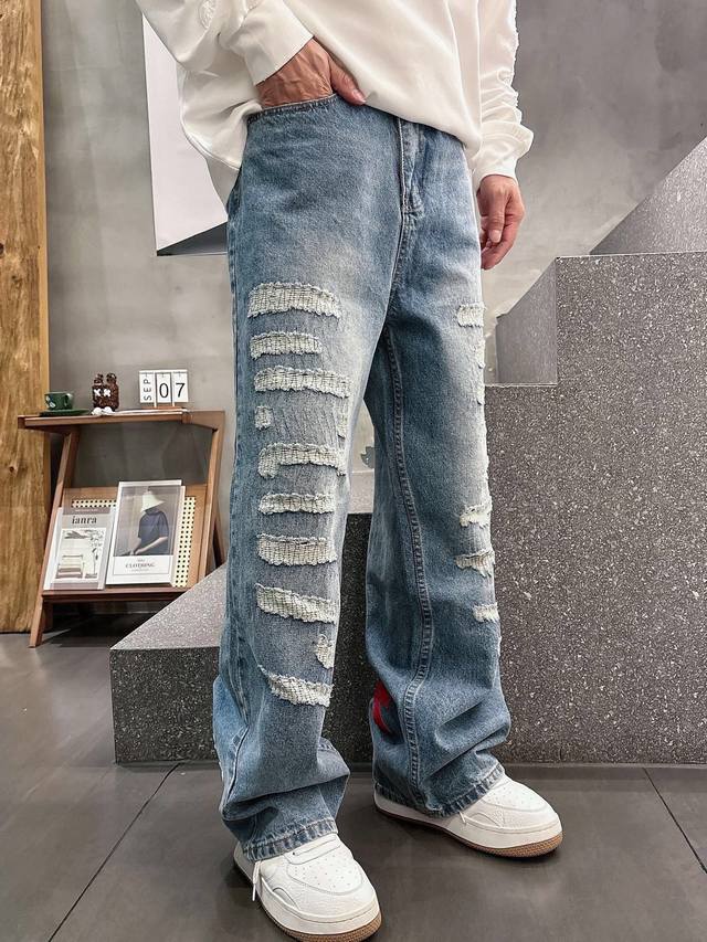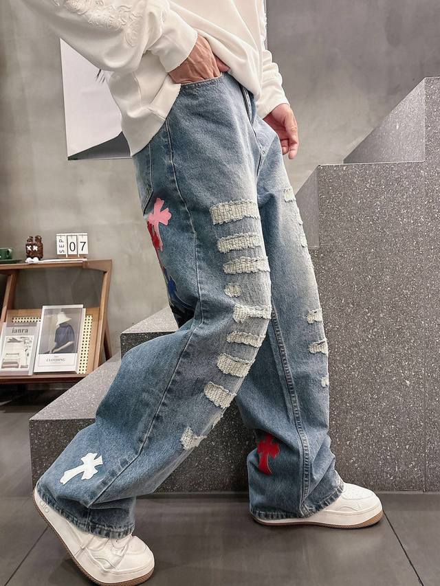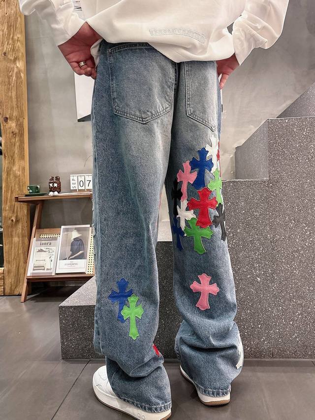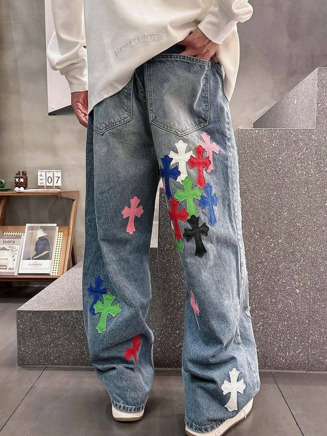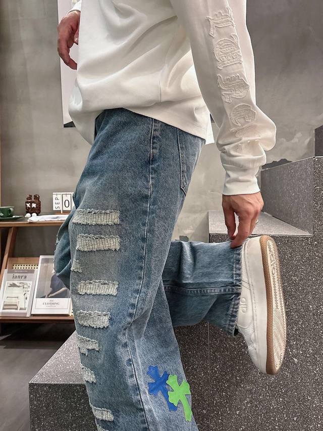 Chrome Hearts Limited Edition Hand-Distressed Distressed Patchwork Leather Washed Jeans (Miami Exclusive). The entire pair of cross-stitched leather is hand-stitched, distinguishing it from embroidered versions. A heavyweight fabric with a moderate thickness and texture, featuring vintage metallic silver label embellishments and custom-made denim stitching. Made from 100% pure cotton raw denim, this denim fabric inherits the advantages of pure cotton: good moisture absorption, breathability, and comfort, while maintaining the durability, wear resistance, and classic color of denim. Colors: Black, Blue. Sizes: S~3X. Style Number: 3753.