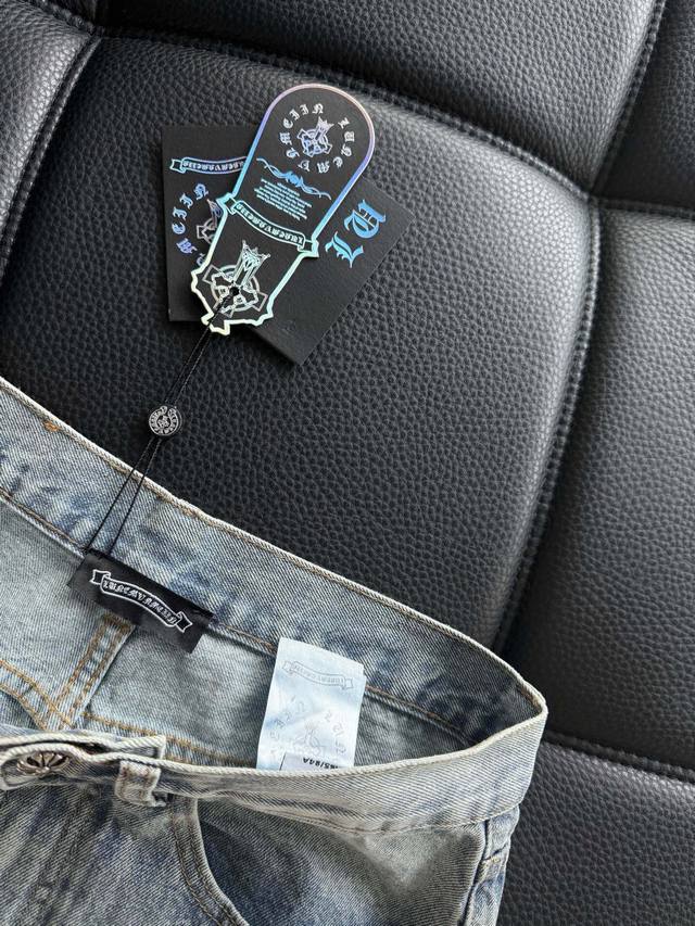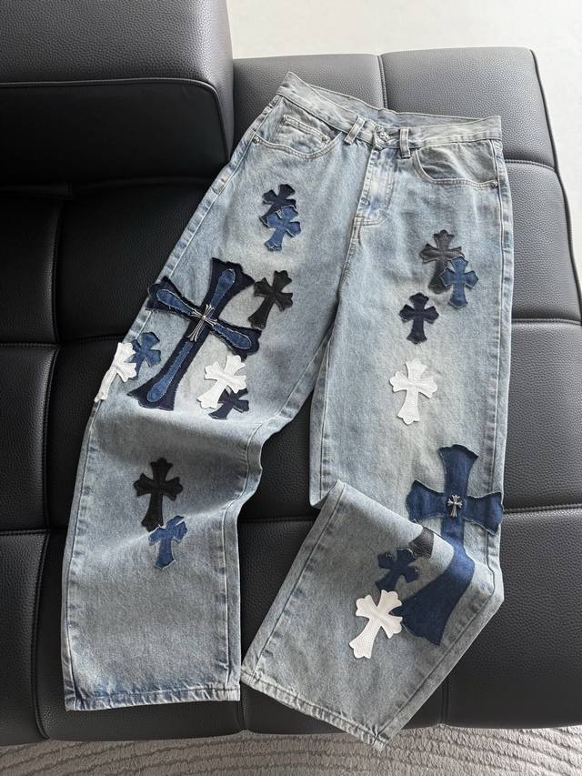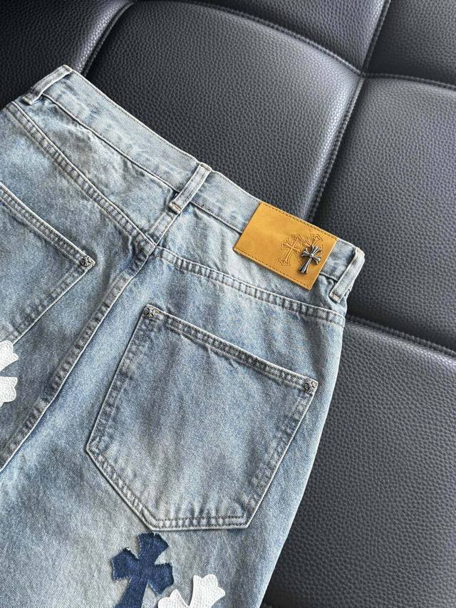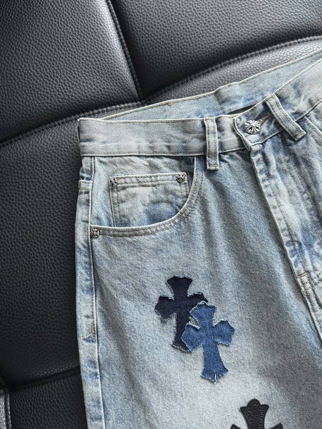Chrome Hearts Limited Edition Hand-Distressed Distressed Patchwork Leather Washed Jeans (Miami Exclusive). The entire pair of jeans features hand-stitched cross-grain leather, distinguishing it from embroidered versions. Made with a heavyweight fabric of moderate thickness and quality, featuring a vintage metallic silver label and custom-made denim stitching. Made from 100% pure cotton raw denim, this denim fabric inherits the advantages of pure cotton: good moisture absorption, breathability, and comfort, while maintaining the durability, wear resistance, and classic color of denim. Colors: Black, Blue. Sizes: S~3X. Style Number: 3756.