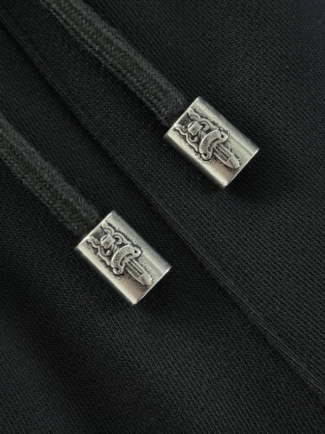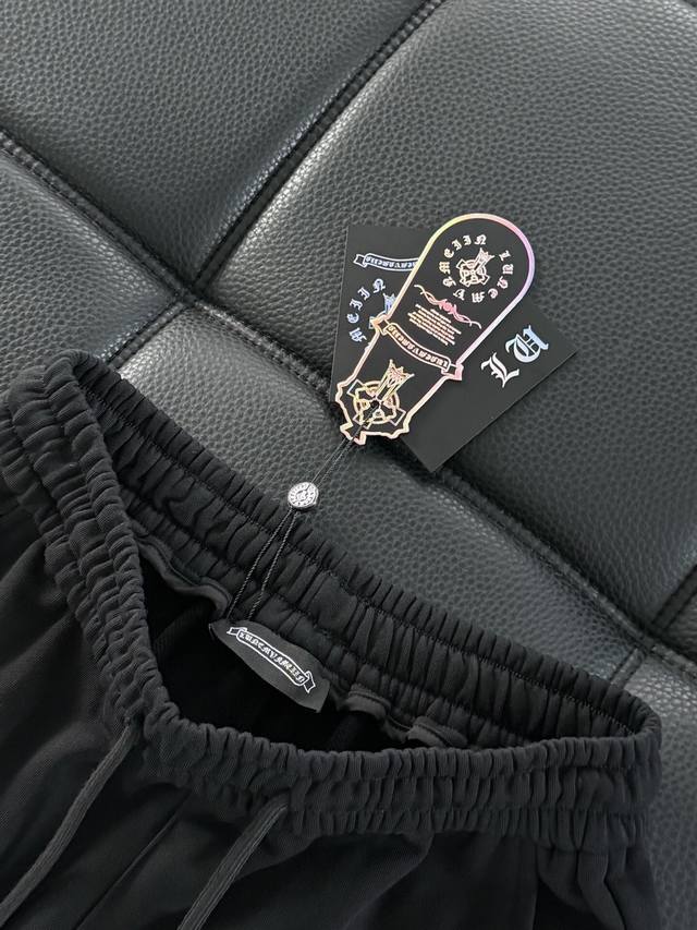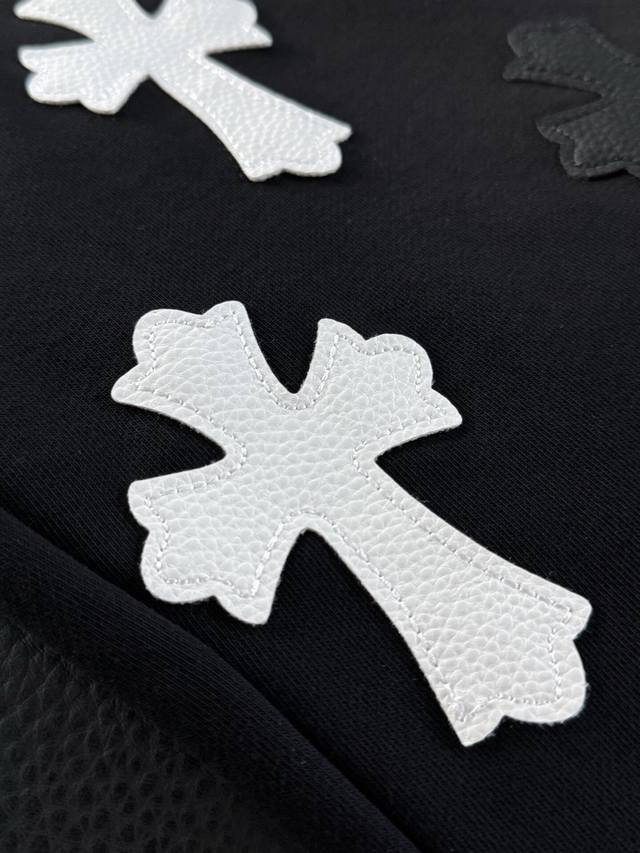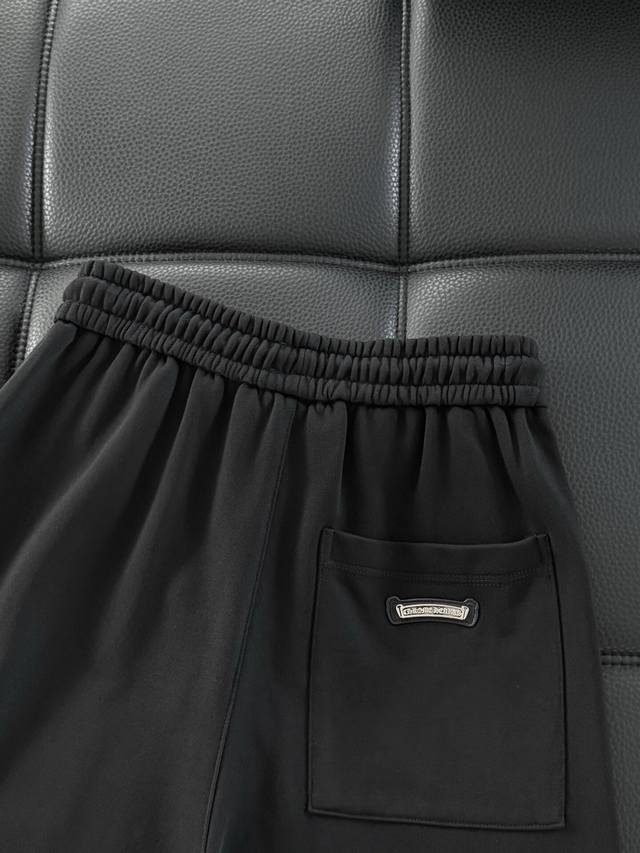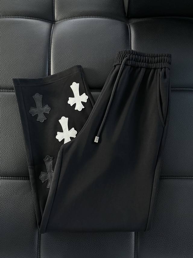 Chrome Hearts Limited Edition Leather Patchwork Casual Terry Sweatpants. The entire piece of cross-grain leather is hand-stitched, distinguishing it from the embroidered version. Made with a heavyweight fabric of moderate thickness and texture, featuring a vintage silver metallic label. Manufactured using a special machine with inlaid stitching, it boasts excellent moisture absorption, breathability, comfort, and durability. Unisex. Color: Black. Sizes: M~3X. Style Number: 3760.