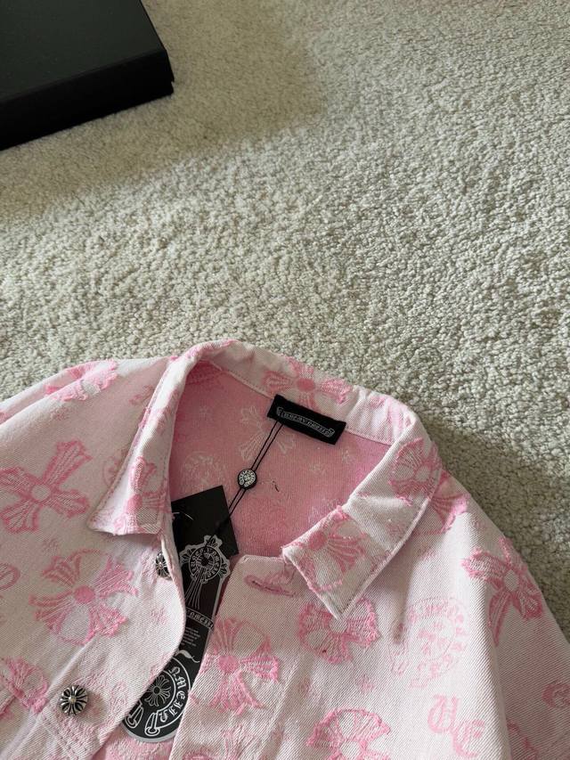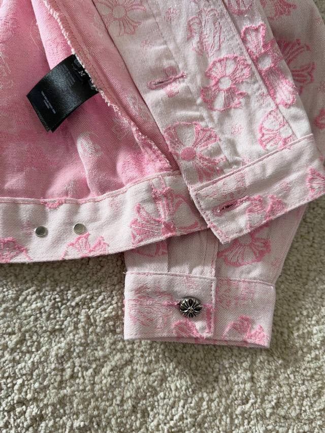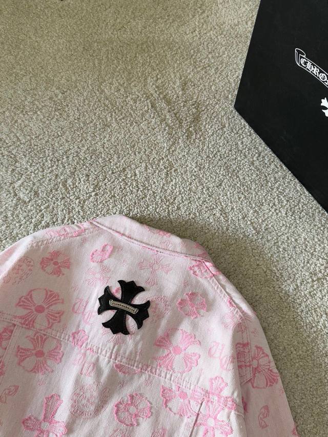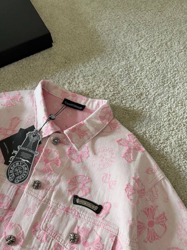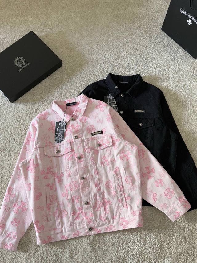 Chrome Hearts New Jacquard All-over 3D Applique Logo Jacket. The entire garment is made of custom-woven heavyweight denim fabric, with independent hardware molding and heavy-duty washing, resulting in strong water resistance and excellent abrasion resistance. The printed subtle lettering has a good 3D overall effect. After washing, it has a good luster, a soft and thick feel, a simple and versatile design, and is sturdy and does not easily deform. A classic denim jacket is a must-have basic; the design is very classic and versatile