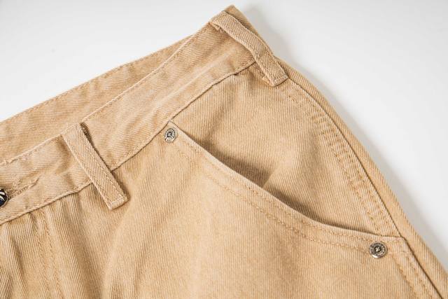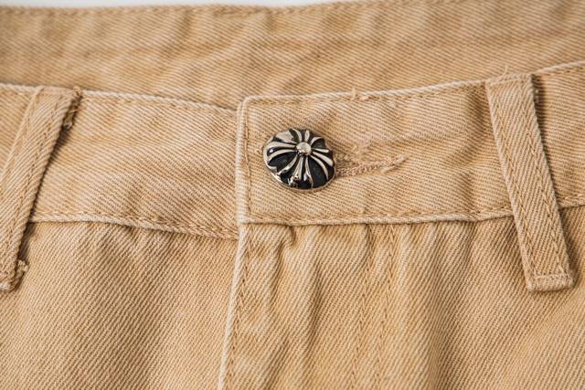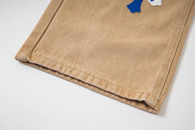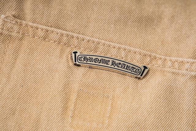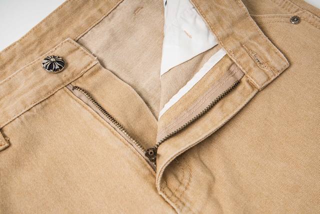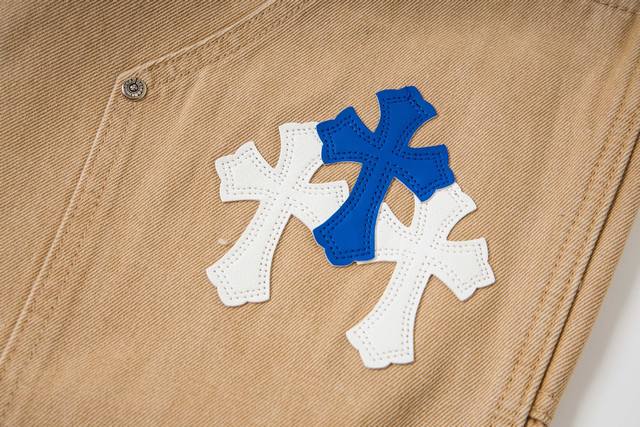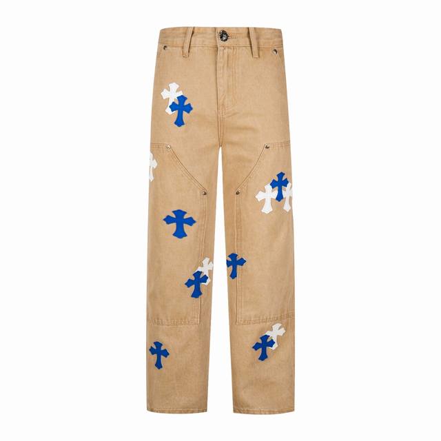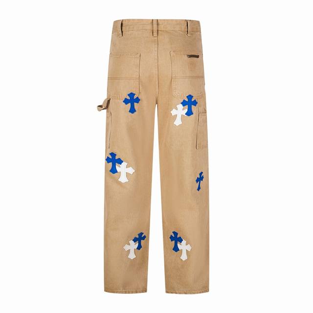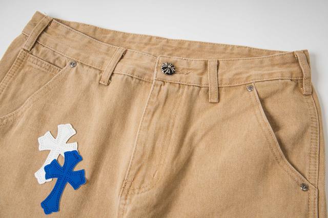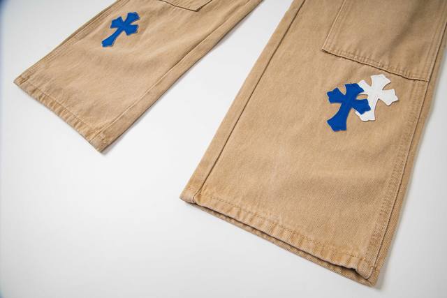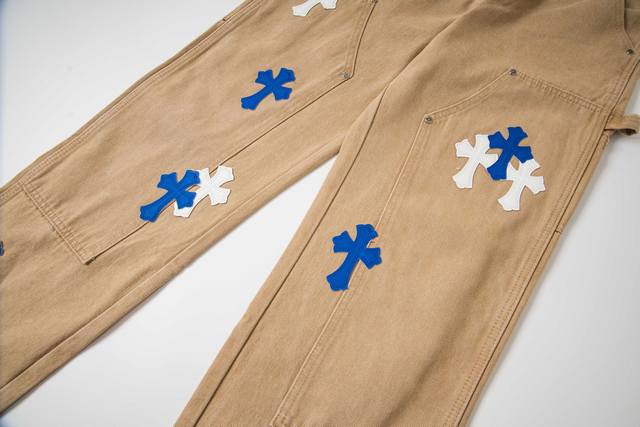 Chrome Hearts Timberwood Khaki Jeans with White and Blue Multi-Leather Patchwork - A Hot-Selling Couple Jeans Style. This season's must-have, favored by countless celebrities and trendsetters. The meticulous tailoring and attention to detail add a touch of playful style. The well-fitting design is uniquely crafted, offering not only striking visual appeal but also a youthful and age-defying look. A style that excels in both wearing significance and styling, featuring a vibrant color scheme. The craftsmanship is exceptional, requiring the finished product to be washed before being disassembled and hand-stitched with sheepskin cross-grain leather before being reassembled. The entire process is incredibly complex. Adorned with cross-grain appliqu
