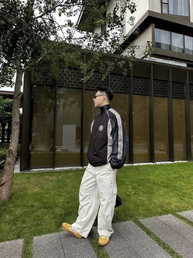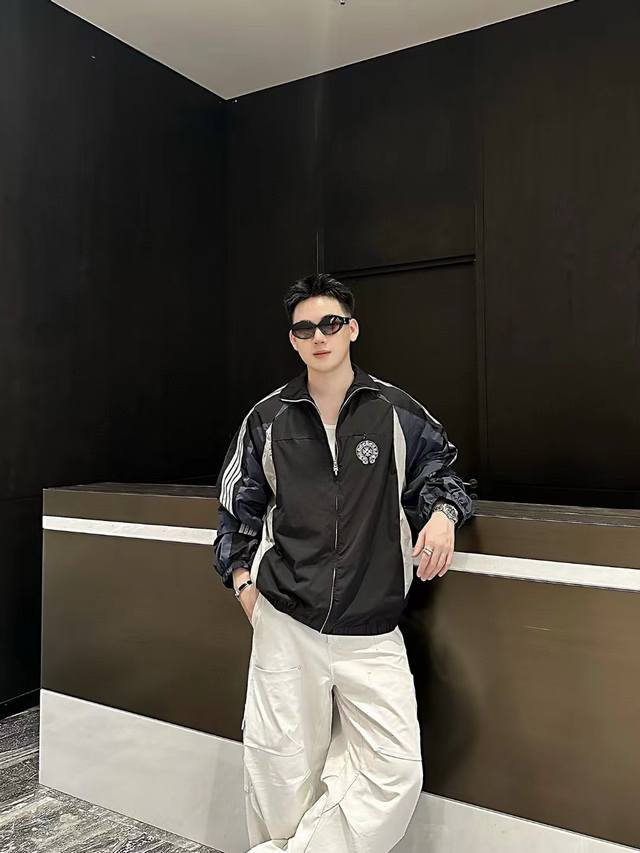 Three patchwork designs look great on the upper body. Gray fabric punching process is perfect for early autumn. Hand-drawn shoulder strips and custom retro cross zippers. Loose fit, very stylish for both men and women