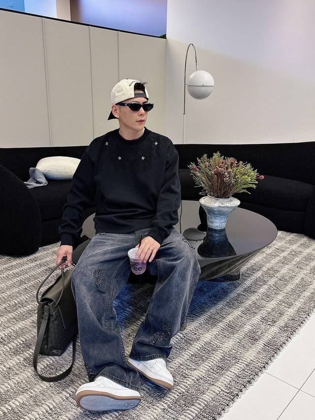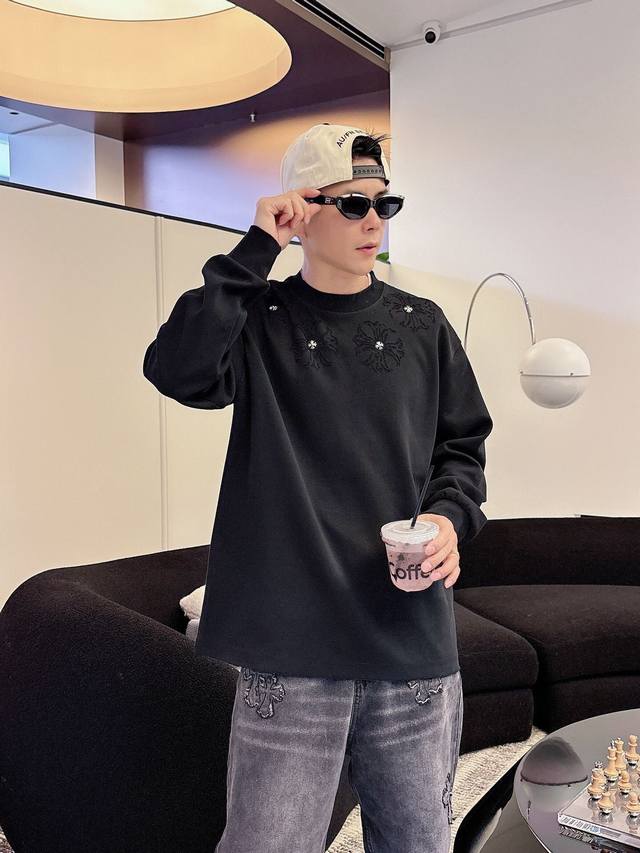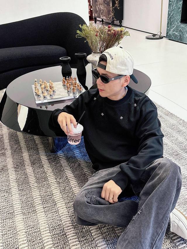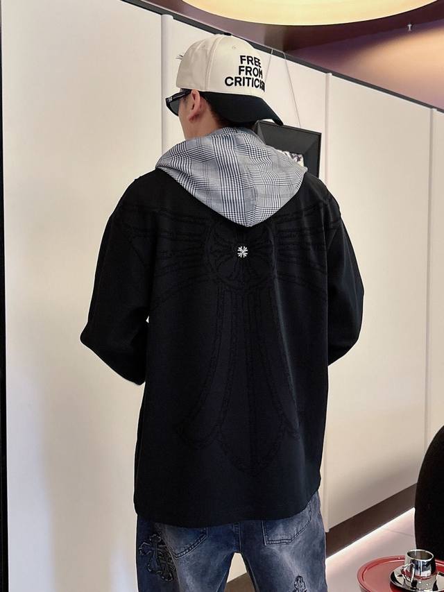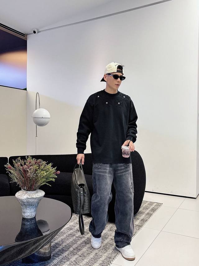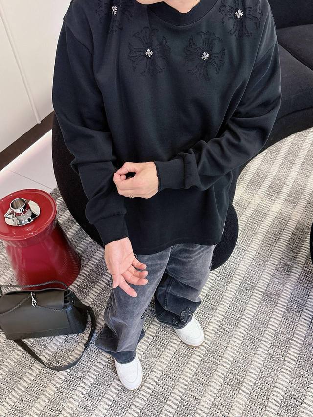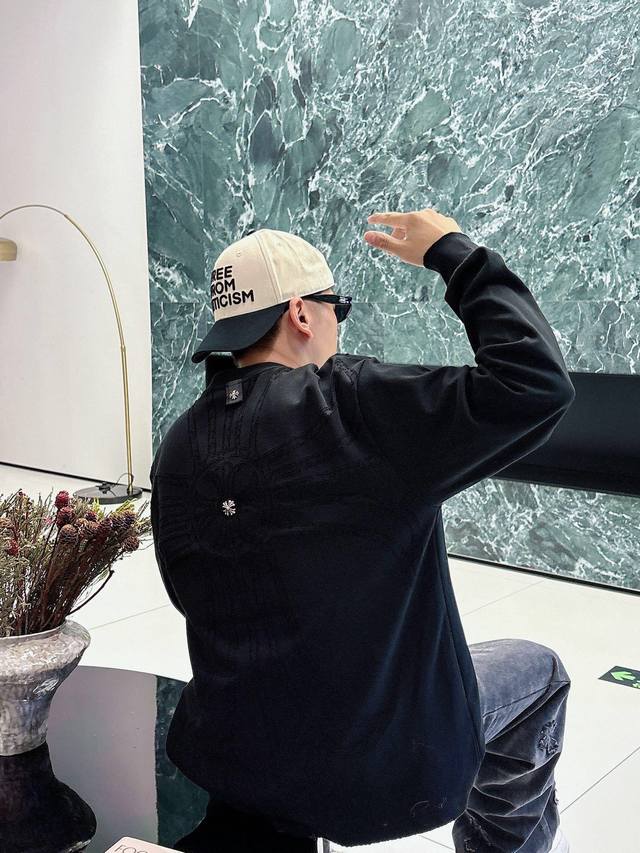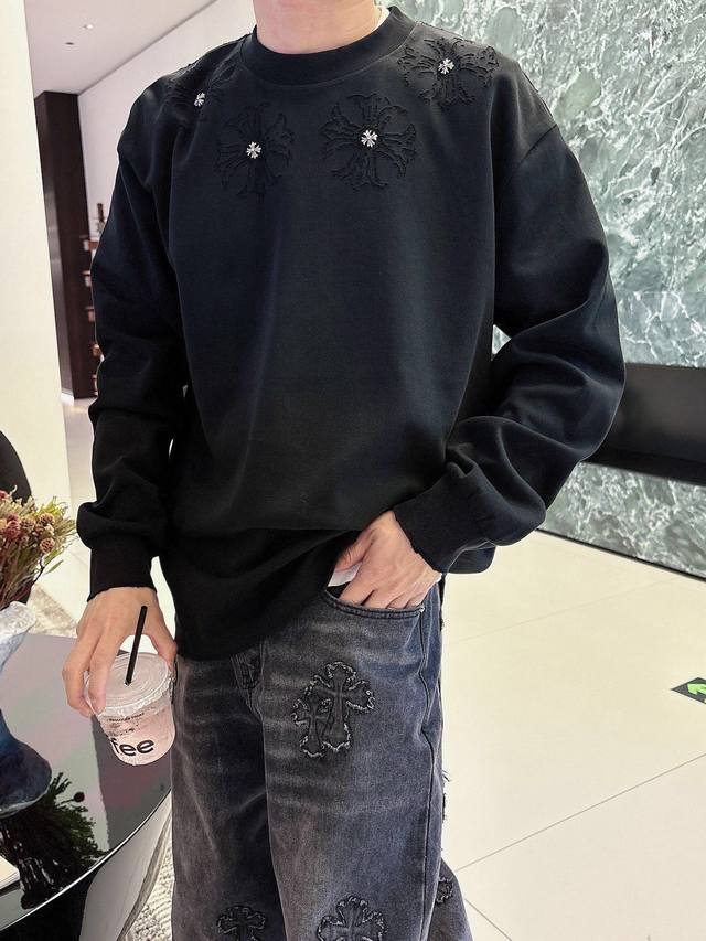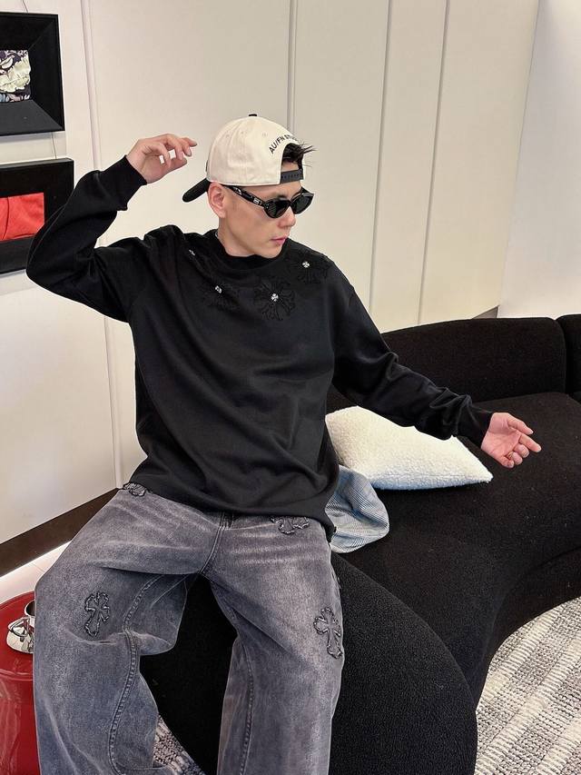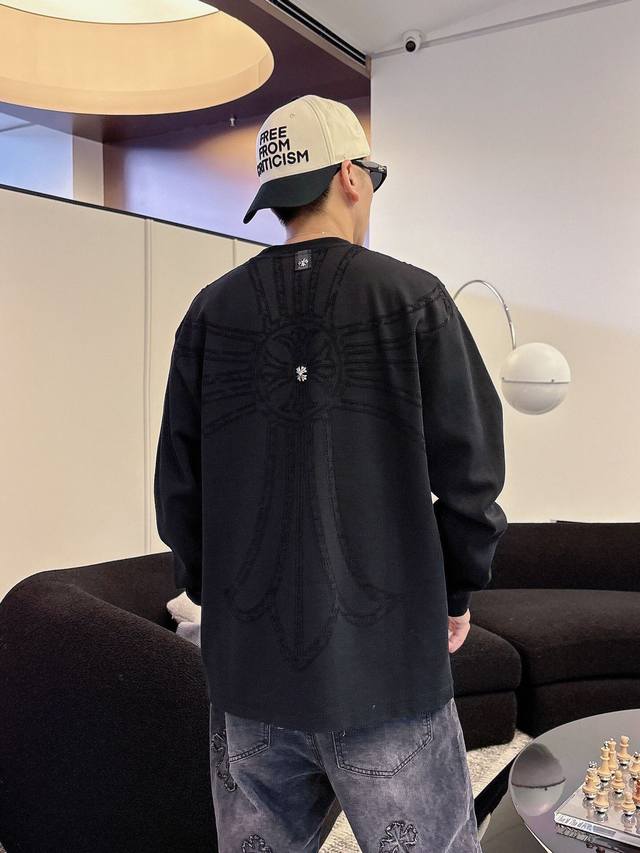 Clothing Ch Chrome Hearts Cross Horseshoe Chrome Hearts Sanskrit Burnished Washed Distressed Long Sleeve Textured Pattern Trendy Brand Original Fabric Laser Burnished Applique Embroidered Letters Exquisite Embroidery Excellent Bestseller.