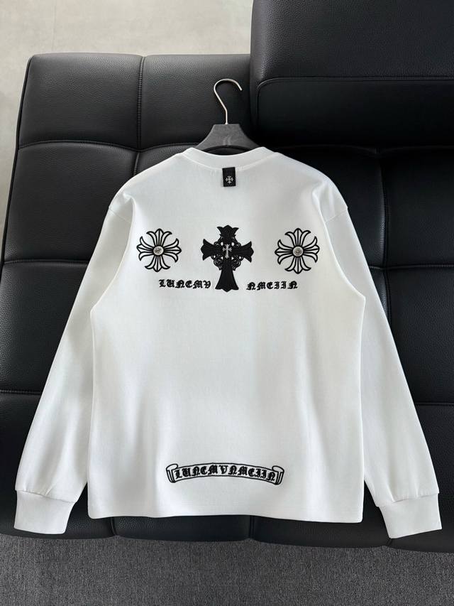 Clothing, Chromehearts Crew Neck Long Sleeve Top. Quality guaranteed! Made with double-sided cotton fabric, the texture is clearly visible, soft, delicate, and smooth. Custom-designed 3D embroidered leather patchwork, excellent drape! Exquisite workmanship, smooth shoulder lines, all shoulder piping is made with imported chains. It has a certain thickness, unlike cheap materials with a shiny finish. Comfortable and not constricting, it's a trendy streetwear item that's easy for both men and women to style! Colors: Black, White Sizes: M-3XL Style Number: 3591