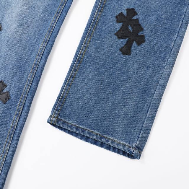 High version Chrome Hearts leather label cross washed jeans, same style for men and women. All Ch jeans need to be washed and then disassembled, and then the sheepskin cross leather is hand-made and spliced together. The whole process is too complicated to describe. The texture is just a matter of taste, and it